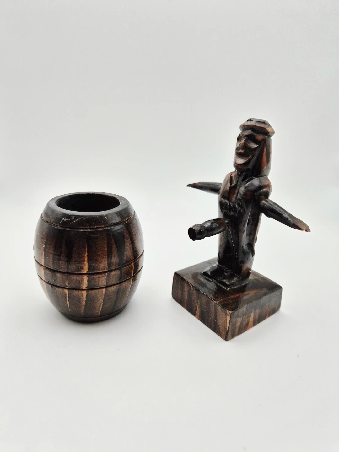 🤣 Wooden Barrel Shaped Container and Figurine
