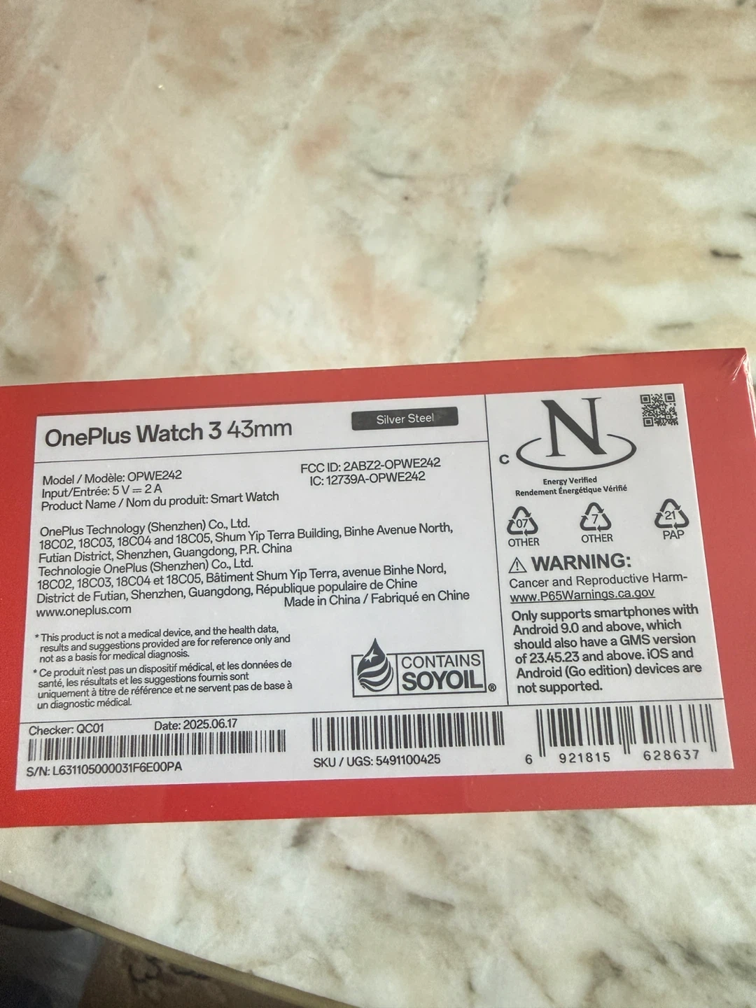 This is a OnePlus Watch 3 in the 43mm size and Silver Steel colour. It's a smart watch model OPWE242. The manufacturing date is June 17, 2025. Only supports smartphones with Android 10.0 and above.