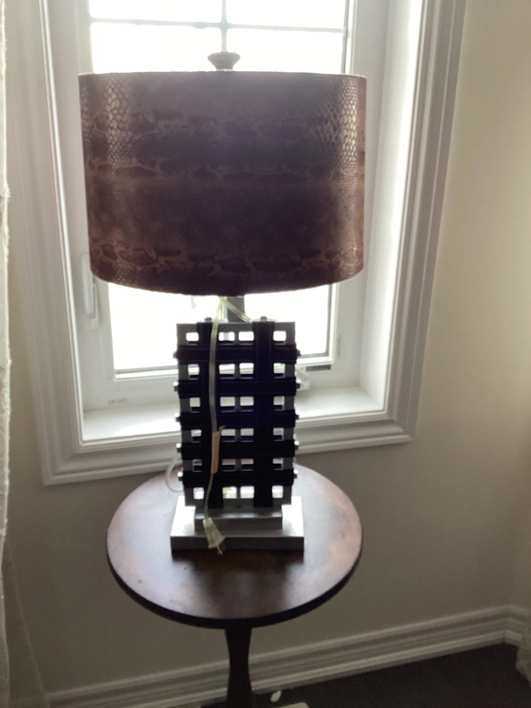 Selling a table lamp with a unique design! It features a brown lampshade with a snakeskin-like texture and a black base with a geometric, stacked design. It's in great condition and would look lovely in any room