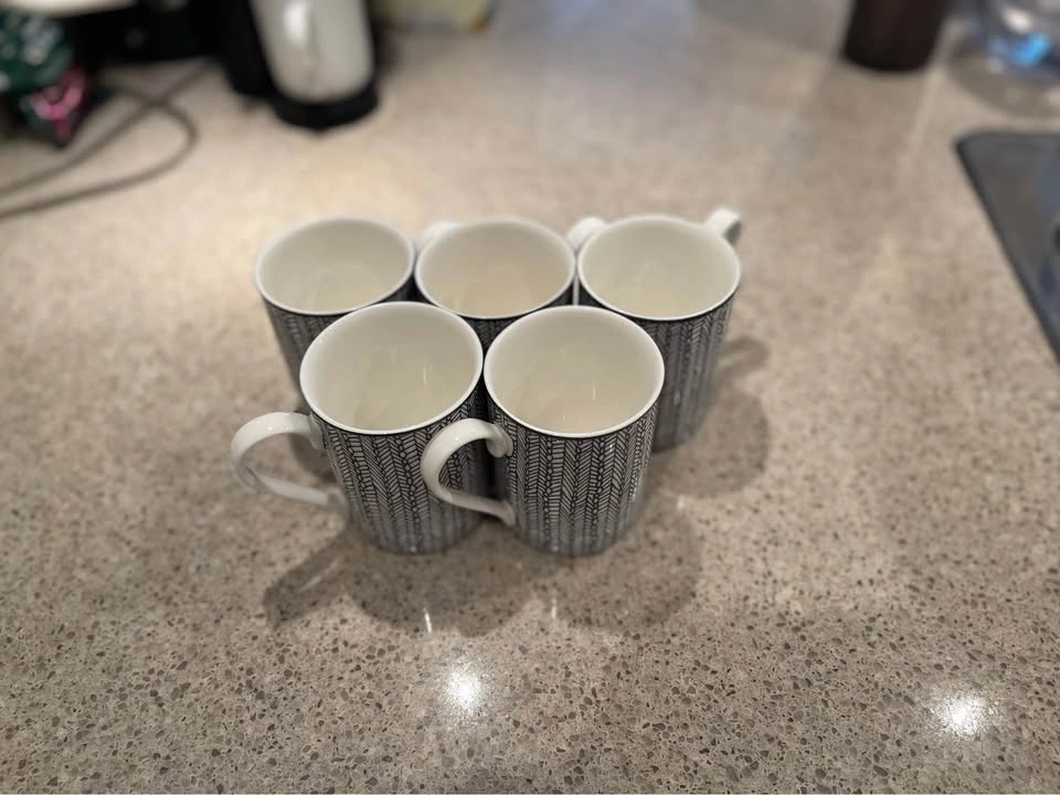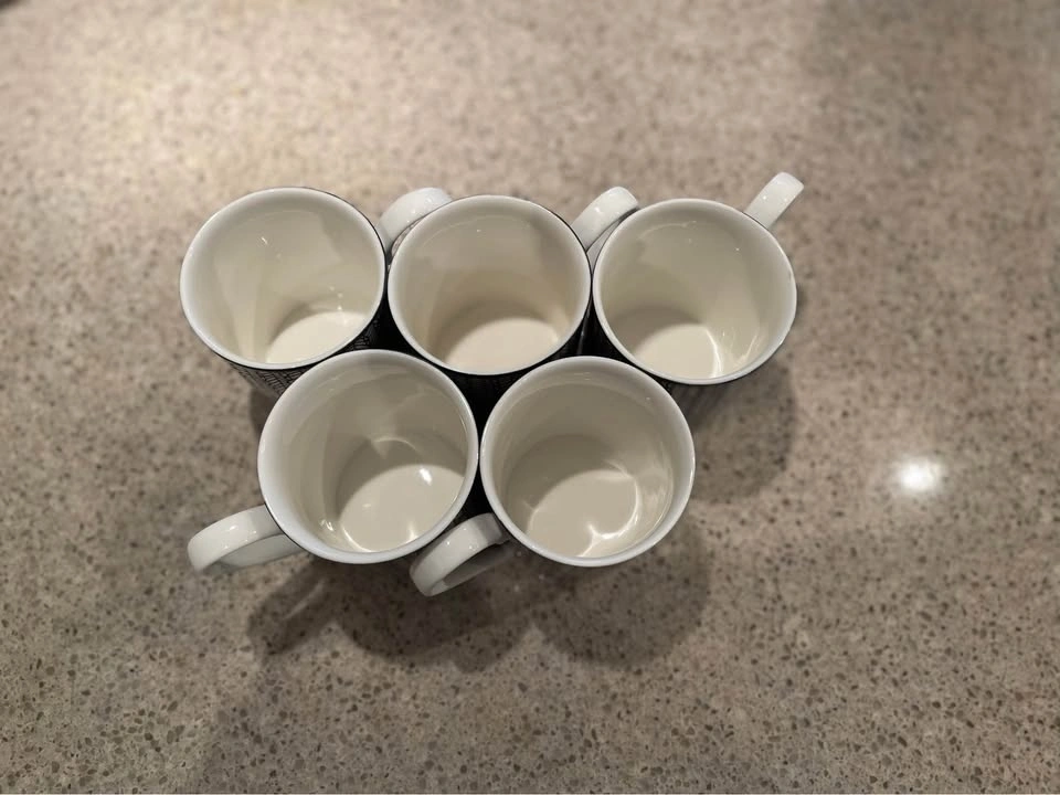 Like-new set of 5 mugs/cups with a clean black-and-white pattern. Great for coffee, tea, or guests. No chips or cracks. Pickup: Downtown Vancouver (Smithe & Hornby). Cash only.