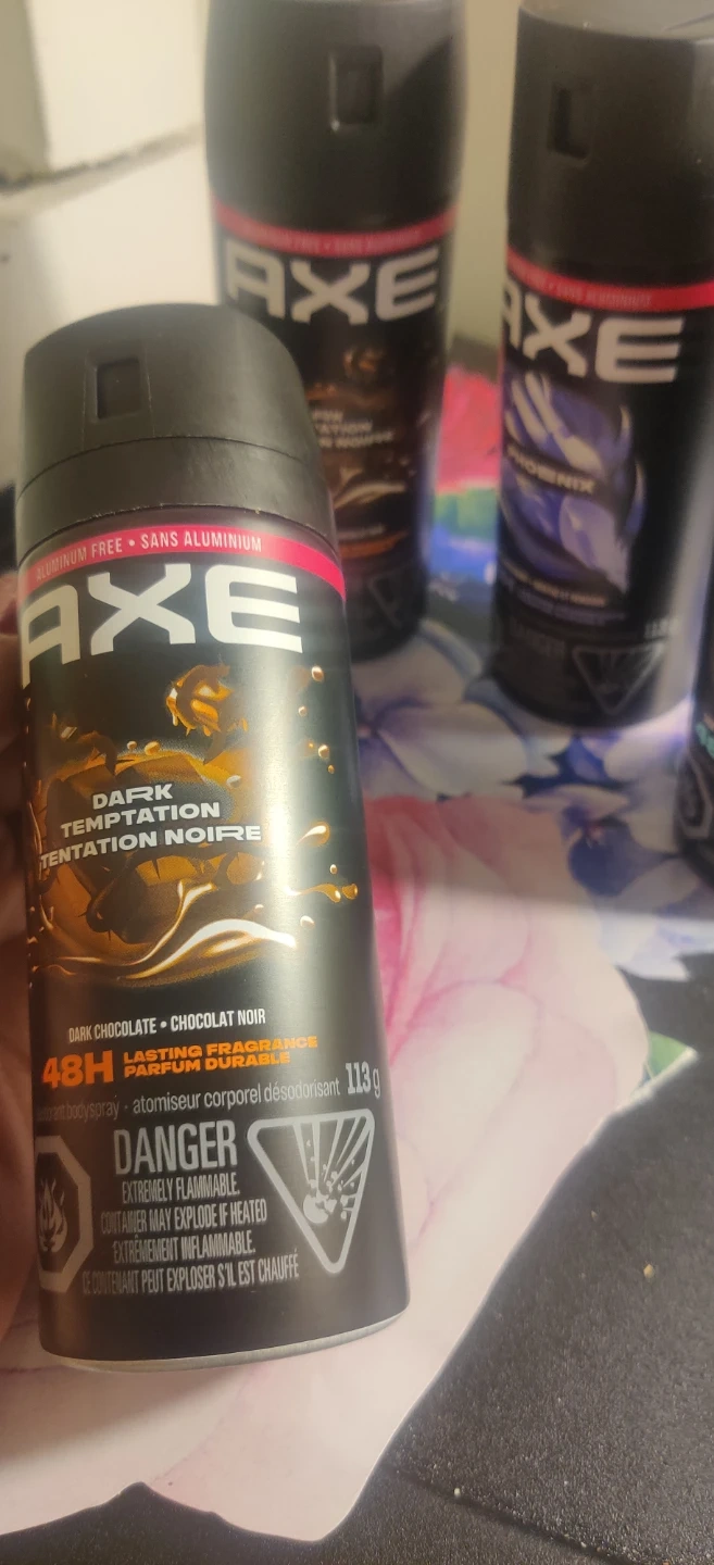 4 cans of Axe deodorant body spray are available. Scents include Dark Temptation, Apollo, and Phoenix. Each can is 113g and offers 48-hour lasting fragrance. These are aluminum-free deodorants.