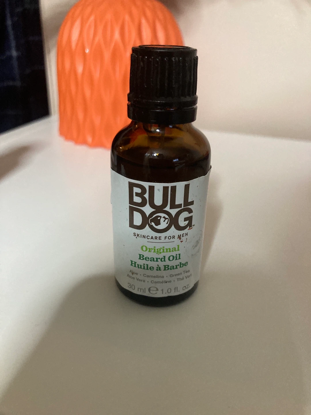 Bulldog Original Beard Oil for men. Contains Aloe Vera, Camelina, Green Tea. It's 30 ml (1.0 fl. oz.). Opened but never used didn’t enjoy the smell.