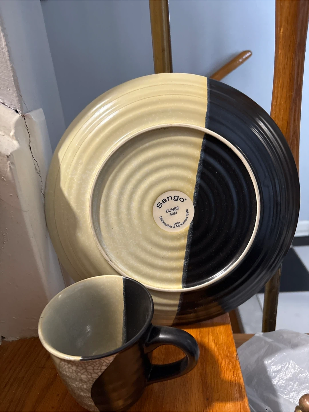 A Sango Dunes plate and mug set in a cool three-tone design. Both pieces are dishwasher and microwave safe. It's a nice set for your morning coffee and toast!