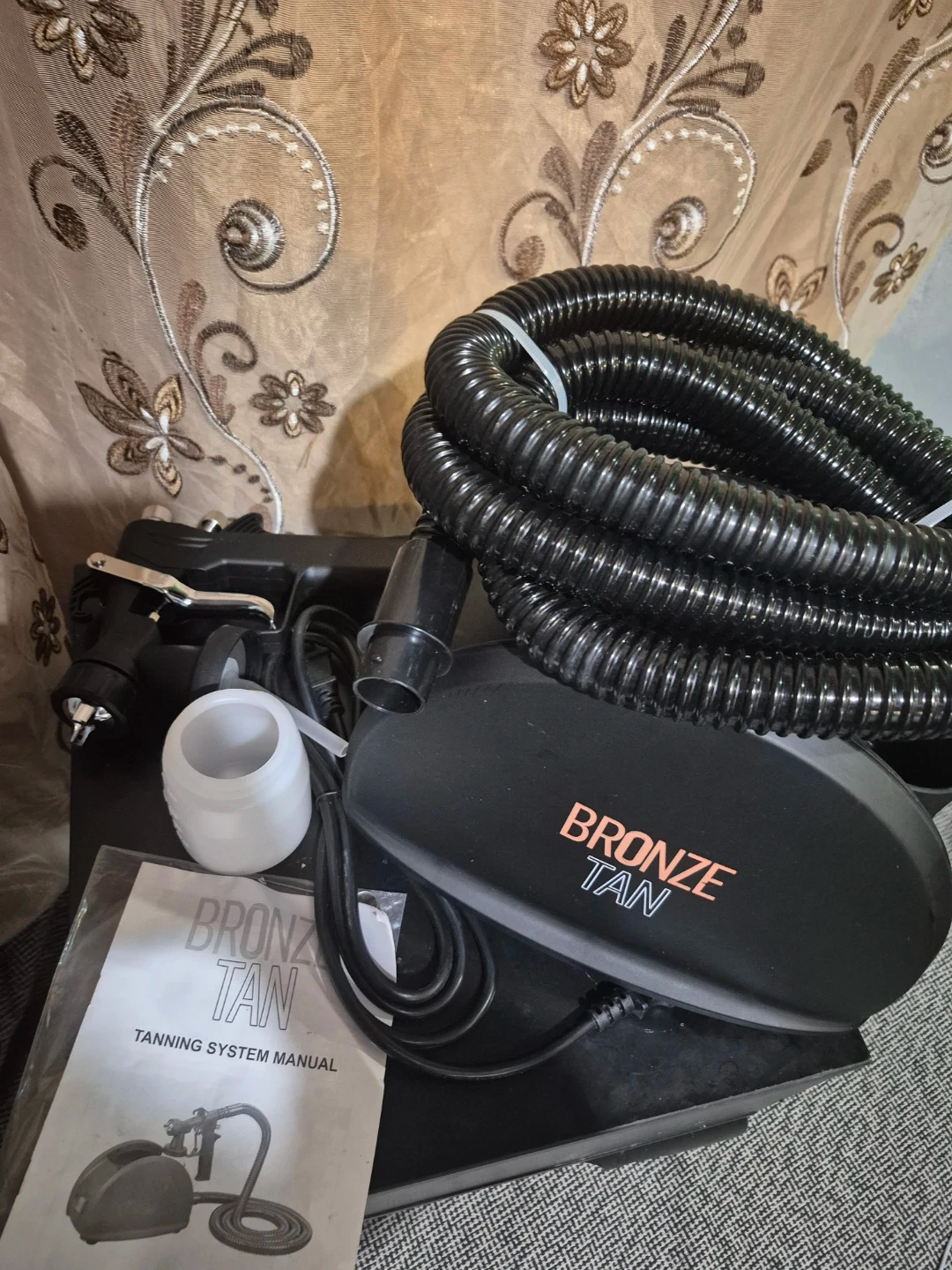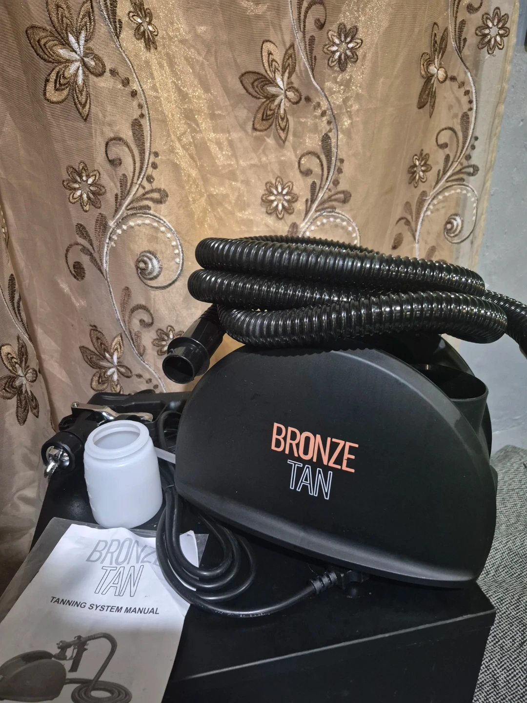 This is a Bronze Tan tanning system. It includes the main unit, a spray gun, and a hose. The manual is also included. Perfect for at-home spray tans!