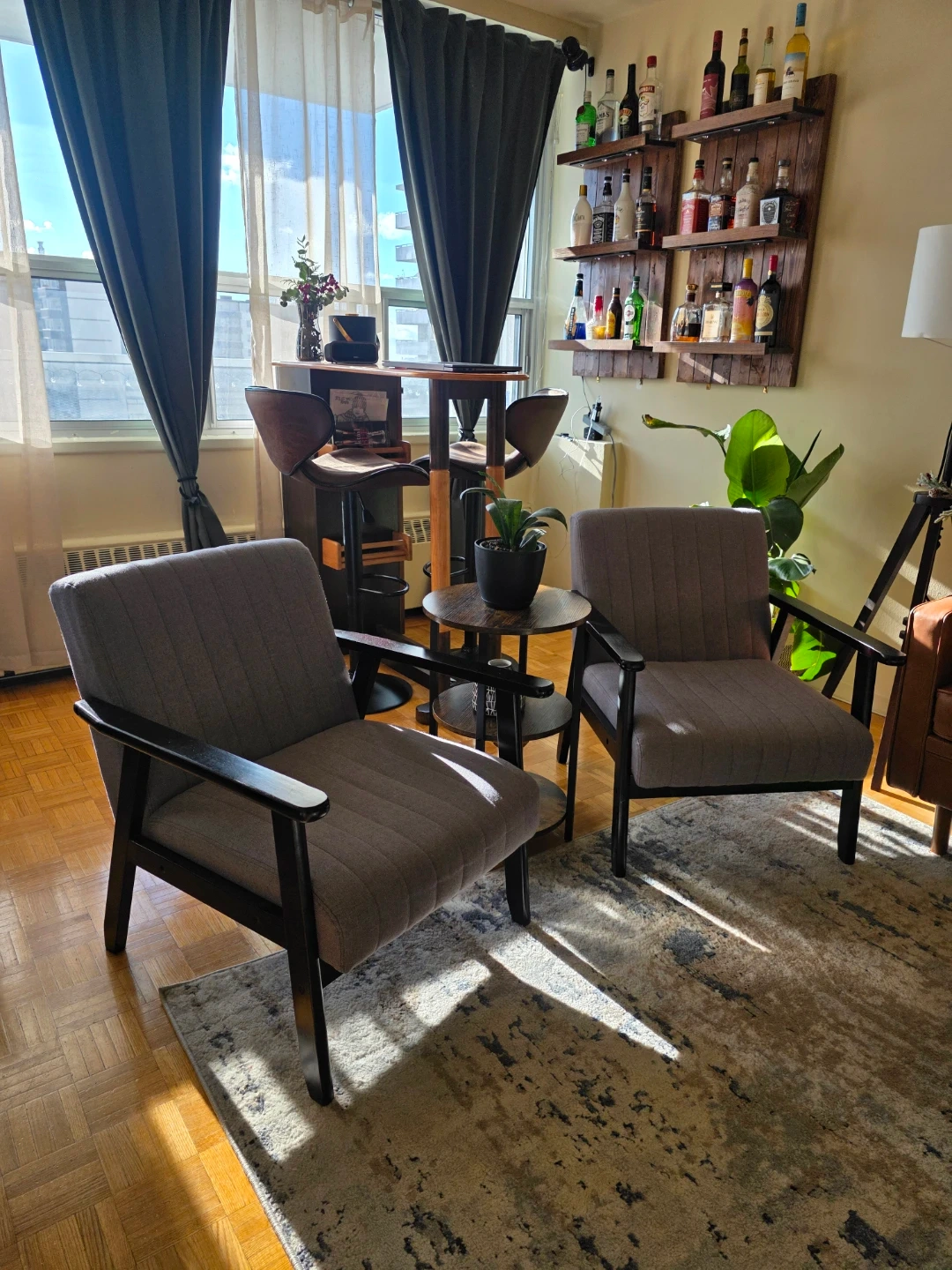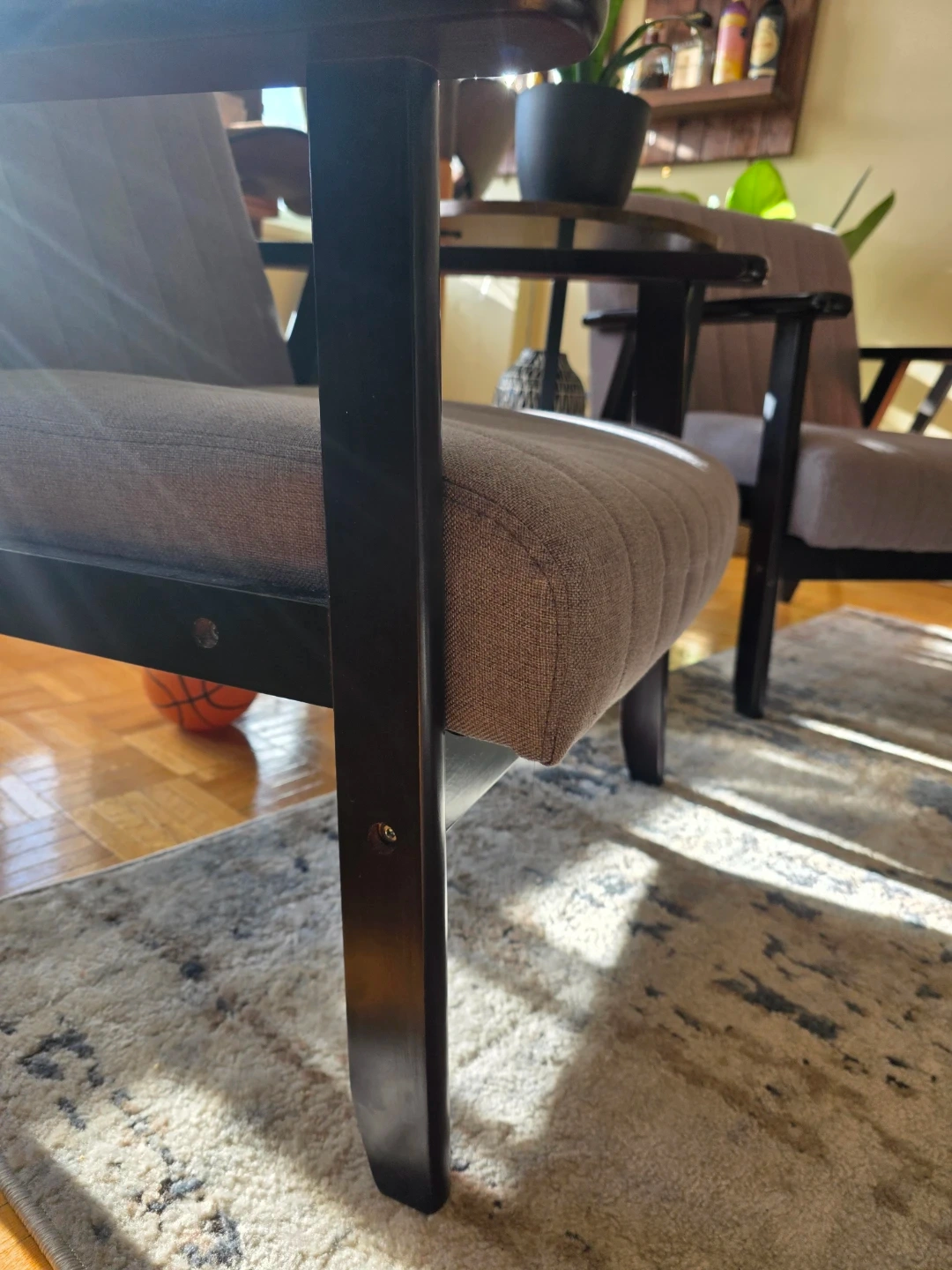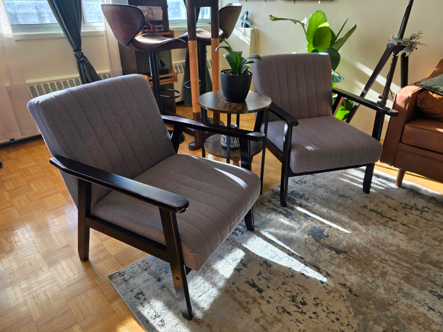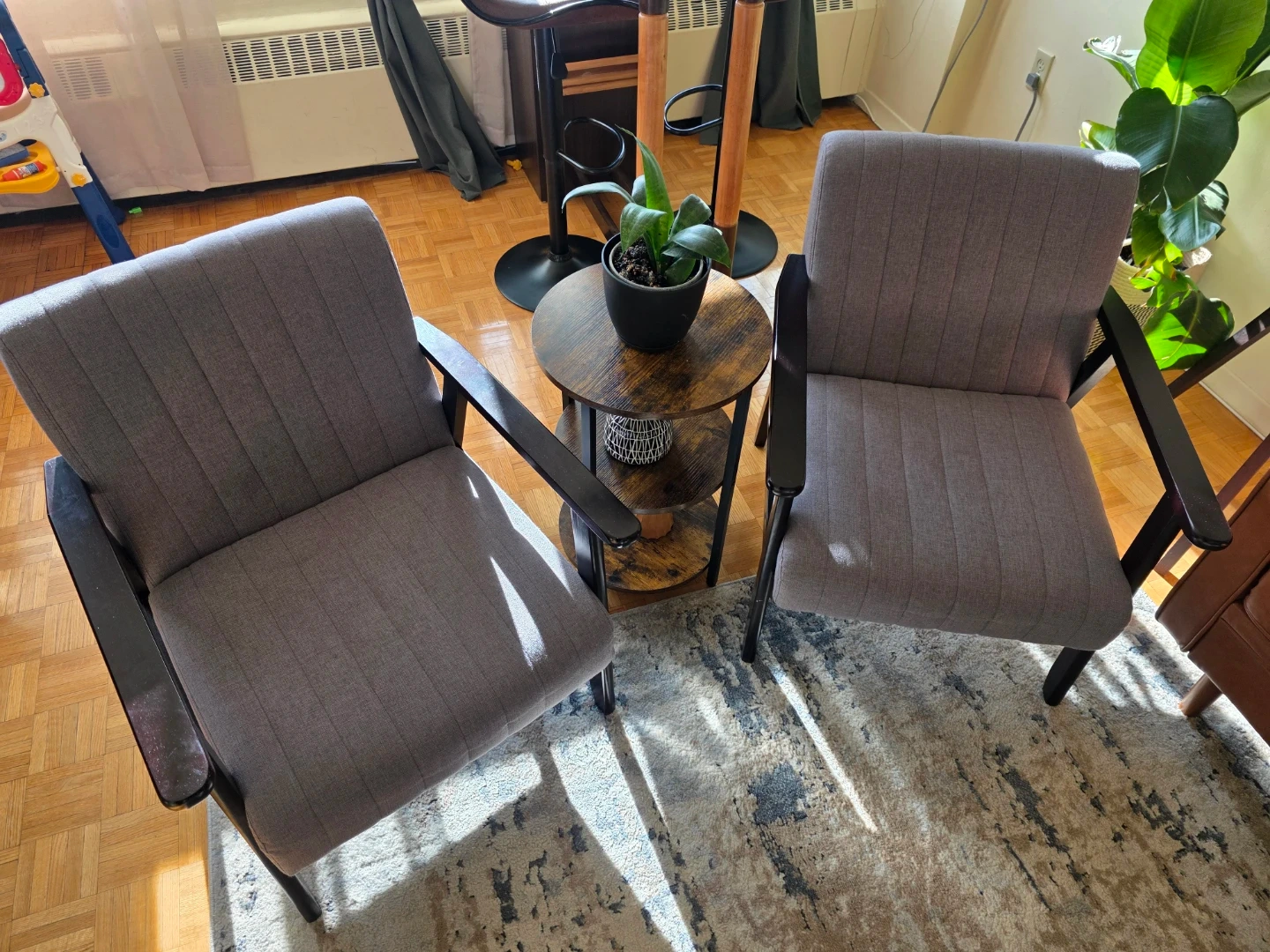 Selling a set of two armchairs. They have a grey fabric seat and back with dark wood arms and legs. They're in good condition and would be great for a living room or den
