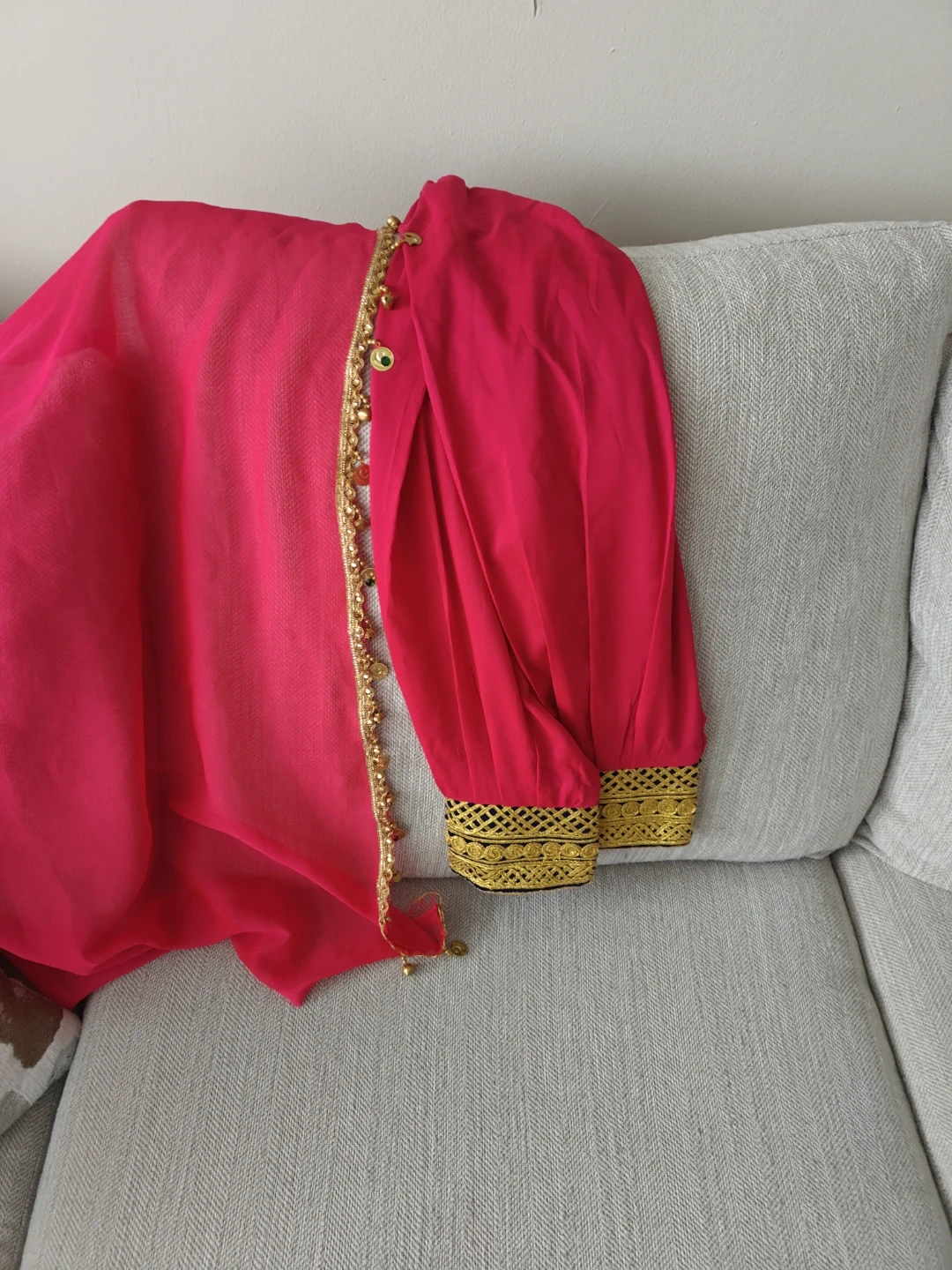 This is a beautiful navy blue velvet Afghan dress set for girls, featuring intricate gold embroidery. It comes with matching pink pants and a vibrant pink scarf. The outfit is embellished with decorative beads and gold trim, perfect for special occasions.