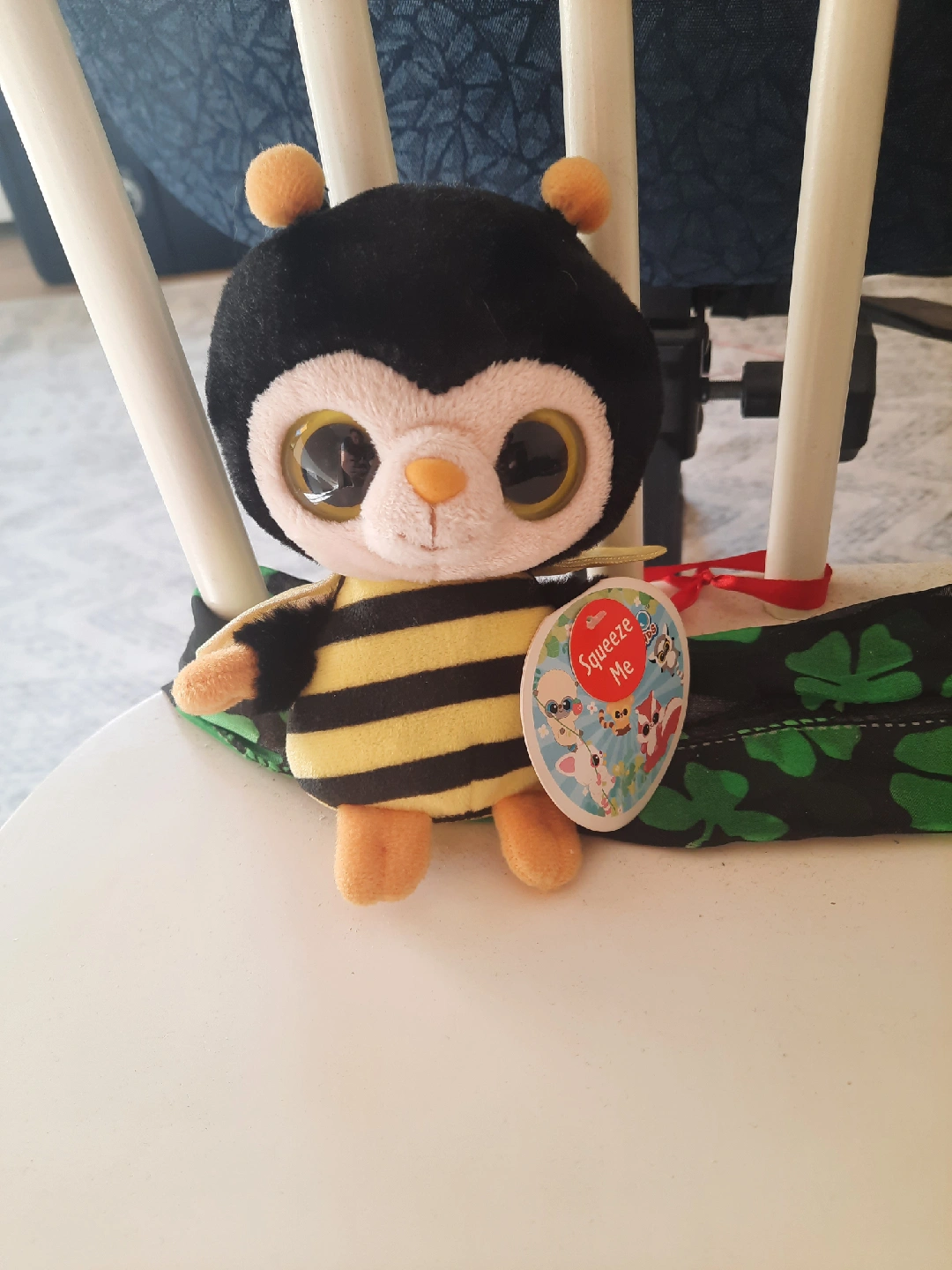 126The object in the image is a plush toy that resembles a bumblebee. It has large, glittery eyes, which are characteristic of the "Beanie Boos" line of stuffed animals. The tag visible on the toy says "Squeeze Me".