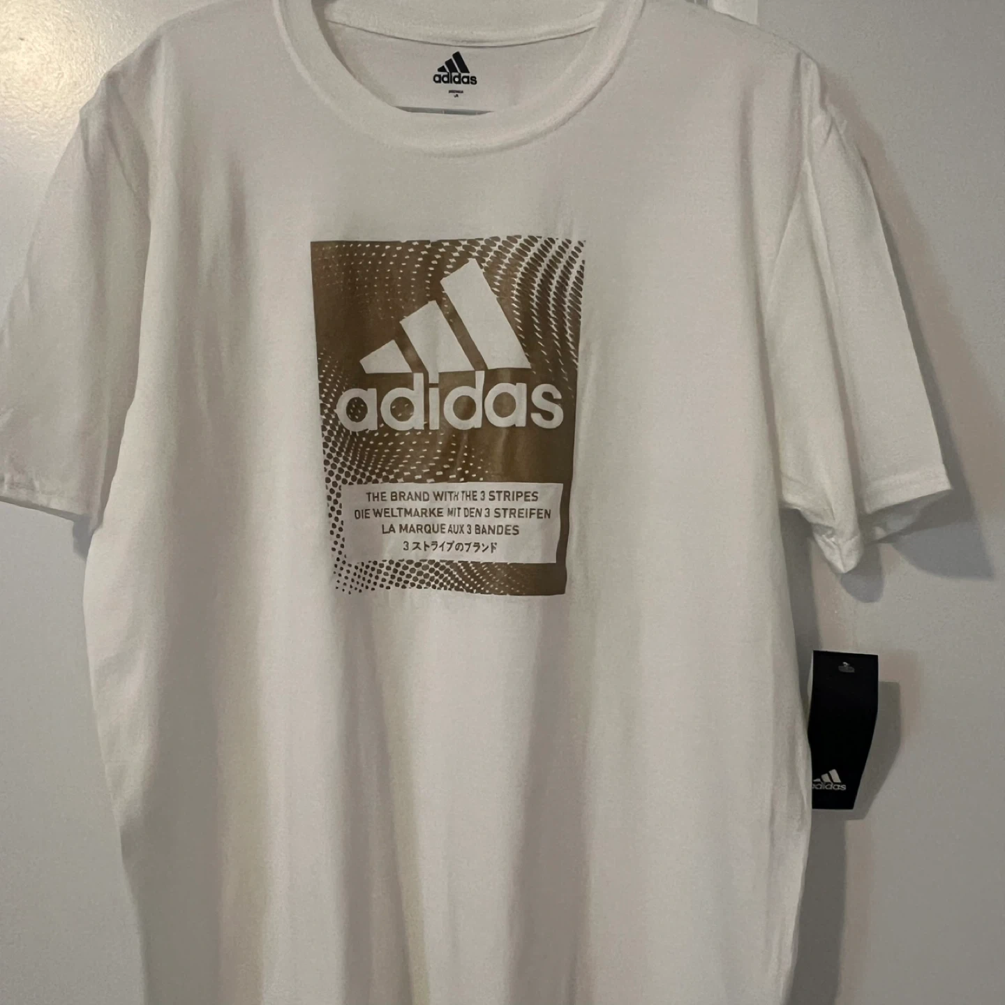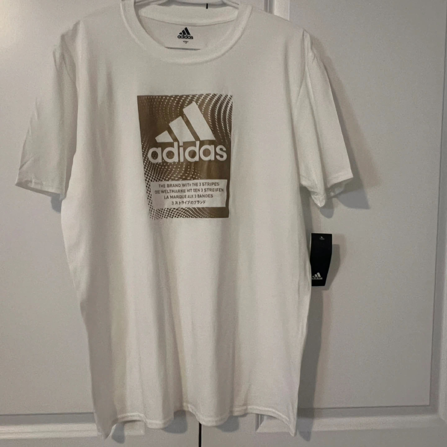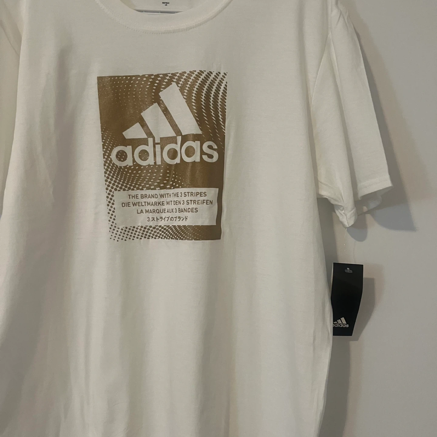 This is an Adidas t-shirt in white. It features a large graphic design on the front with the Adidas logo. Made from comfortable fabric.