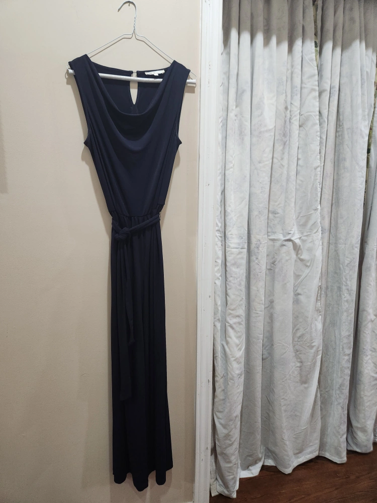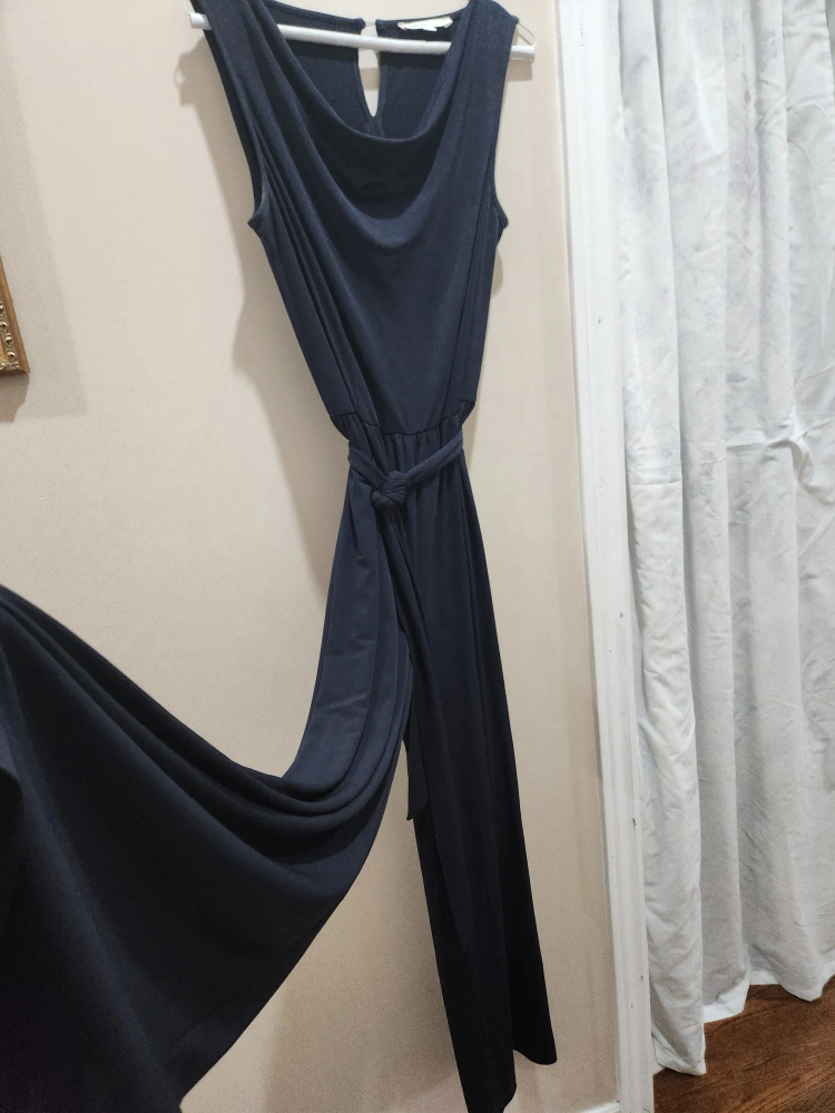 Elegant navy blue jumpsuit. Sleeveless design, wide legs, and a self-tie belt. Scoop neckline with keyhole detail at back. Perfect for a variety of occasions.