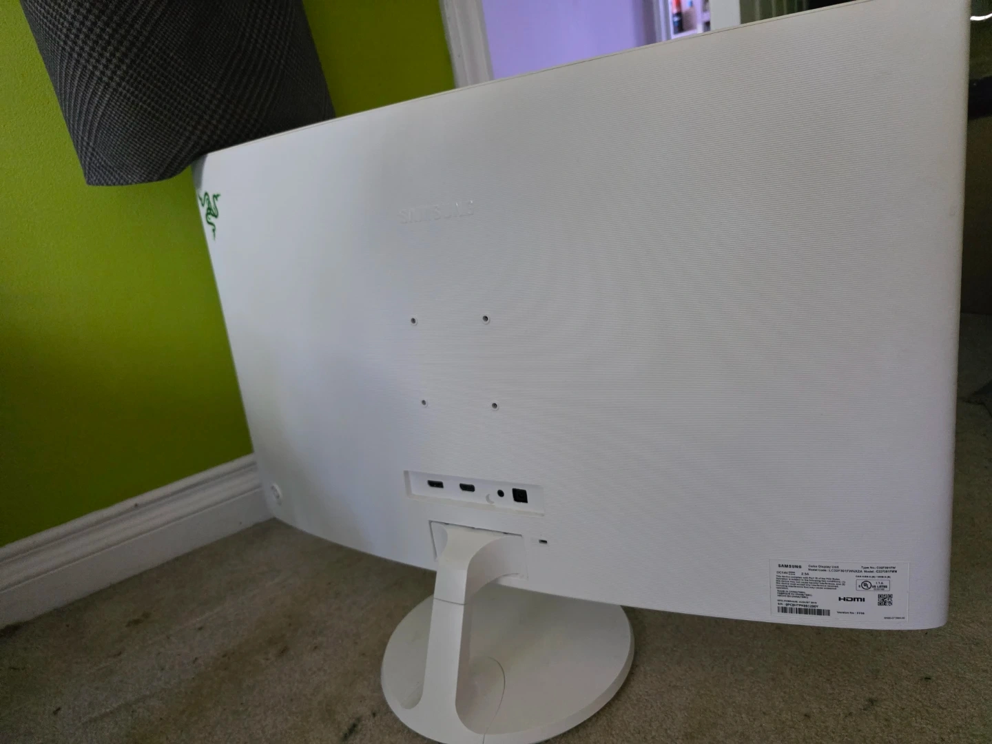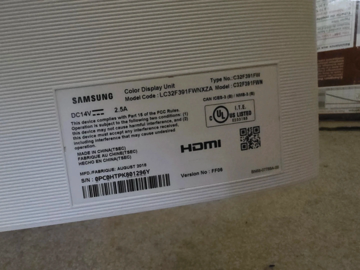 White Samsung C32F391FWN 32-inch curved monitor. Model code LC32F391FWNXZA. Manufactured August 2018. It's a 1920x1080p monitor.