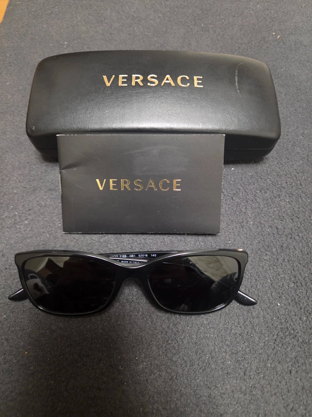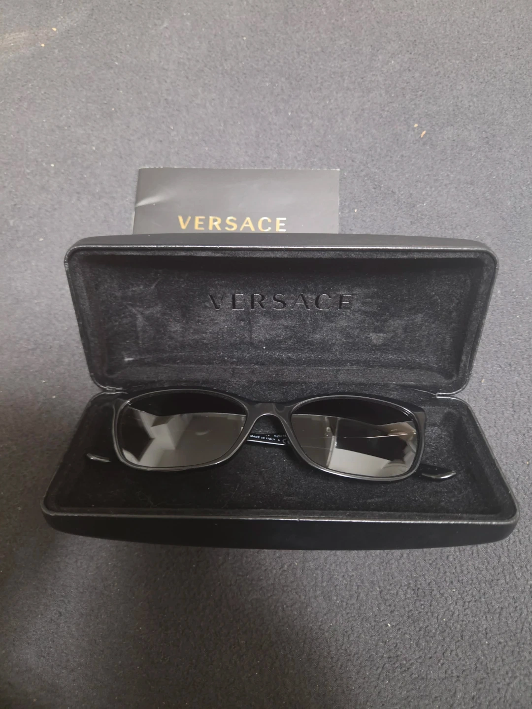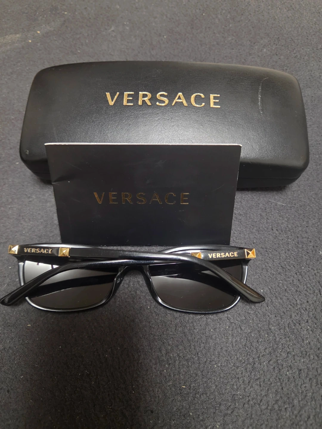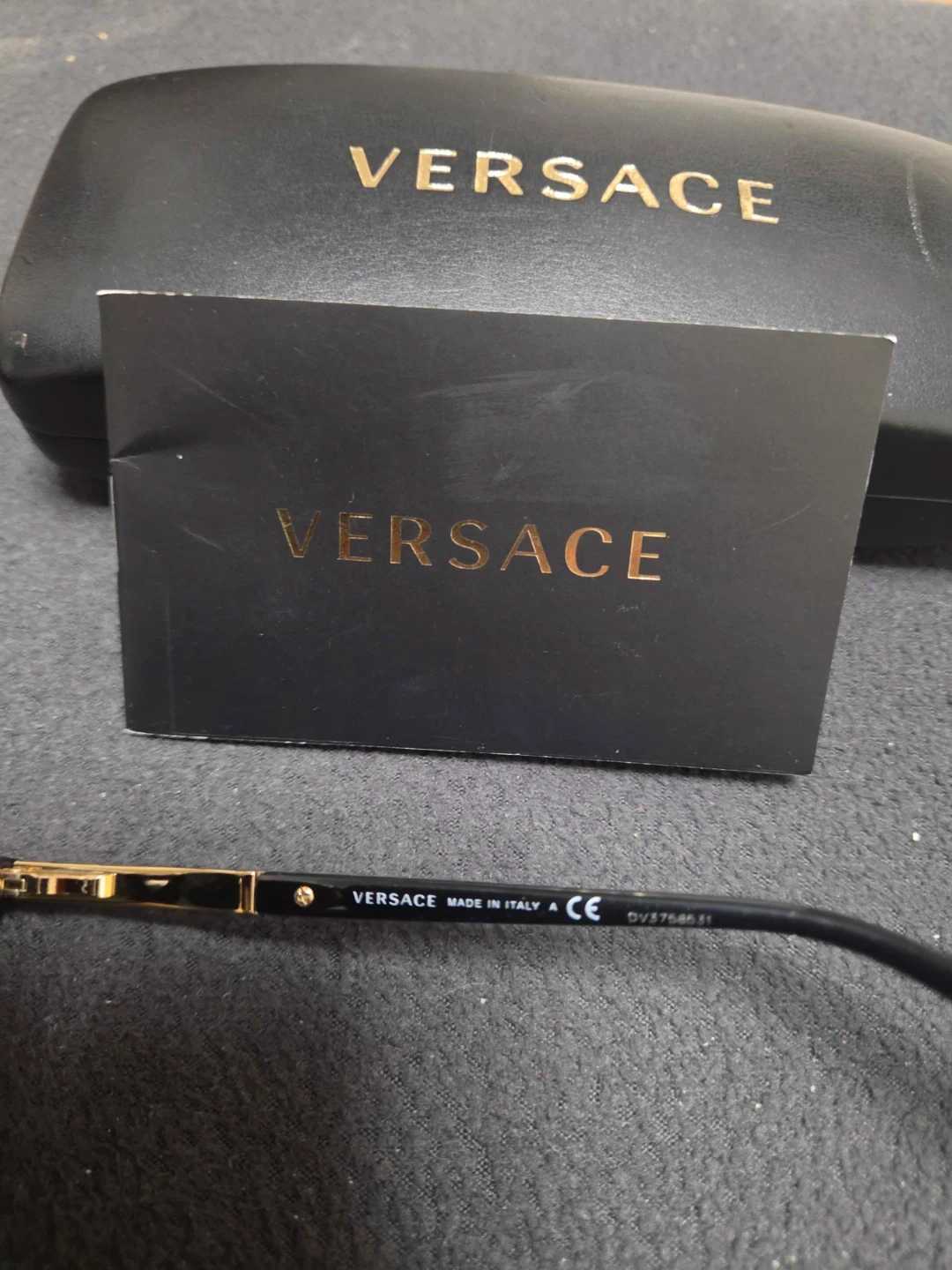 Buy & SellVersace Black Sunglasses with CaseVersace Black Sunglasses with Case$91Versace sunglasses. Black frame with gold accents. Includes original hard case and booklet. Made in Italy. Model DV3756. Lens width 52mm.ConditionLike newBrandVersaceWHERE TO MEETCheck LocationView MapSELLERverifiedLuzAstoria904 reviews2 chats·1 favorites·45 viewsSEND CHAT TO SELLERHi Luz! I’m interested in your listing.Hi Luz! I’m interested in your listing.Get the Karrot app to chatSign In to chat