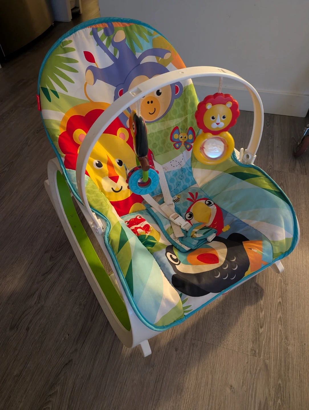 Selling a gently used Fisher-Price Infant-to-Toddler Rocker. It's in great shape and ready for a new little one! The rocker features a fun jungle theme with colourful animals and a toy bar to keep your baby entertained. It can be used from infancy through the toddler years, making it a versatile and long-lasting piece of baby gear.