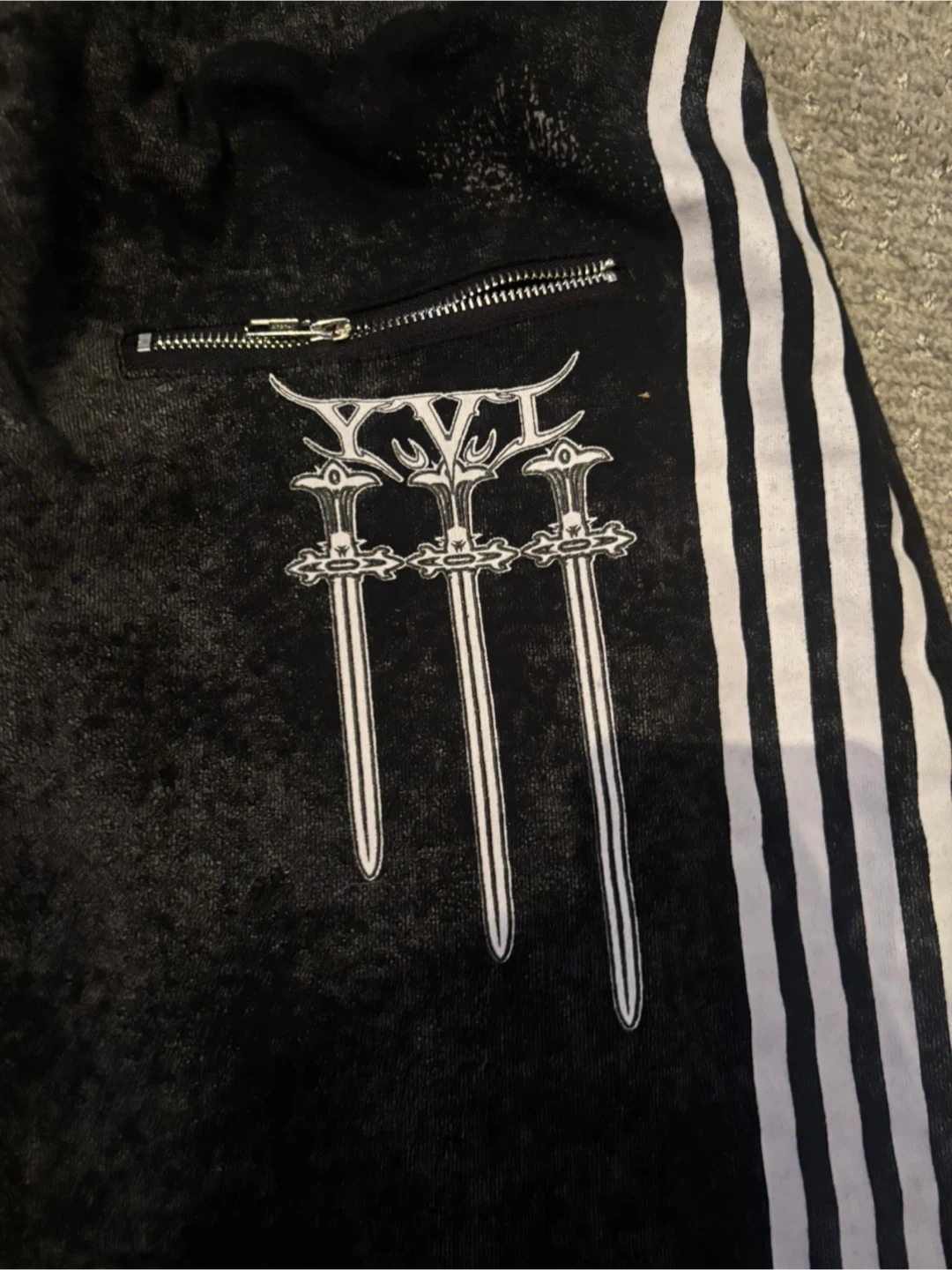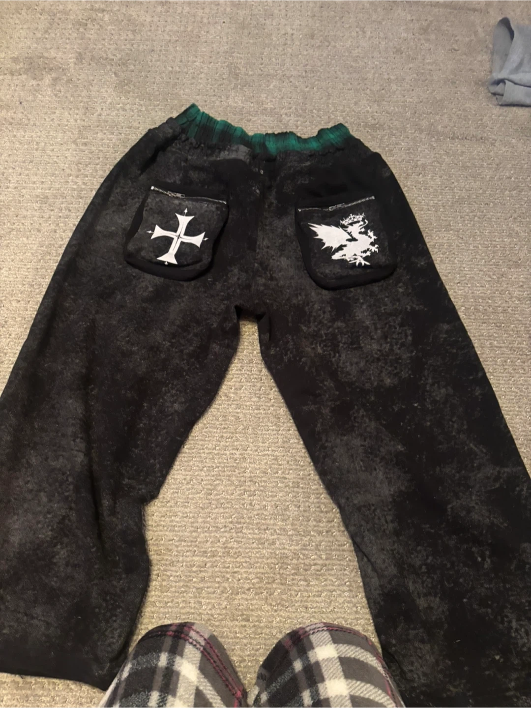 These pair of Cozy Worldwide Royal Knight Club Waxed Tracksuit pants joggers are a size L. They feature a unique graphic design on the back pockets and down the side stripes. The material is soft and comfortable, perfect for casual wear.