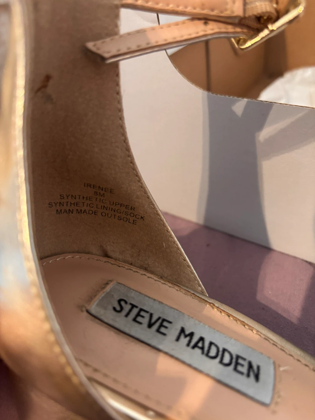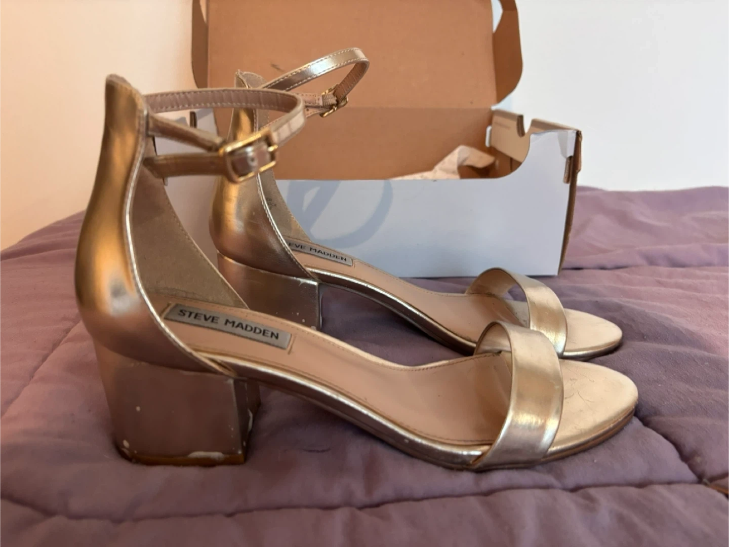 Selling my Steve Madden “Irenee” two-piece gold block-heel sandals. I bought these for prom and only wore them a few times — they’re super comfy and easy to walk in thanks to the chunky heel + ankle strap.