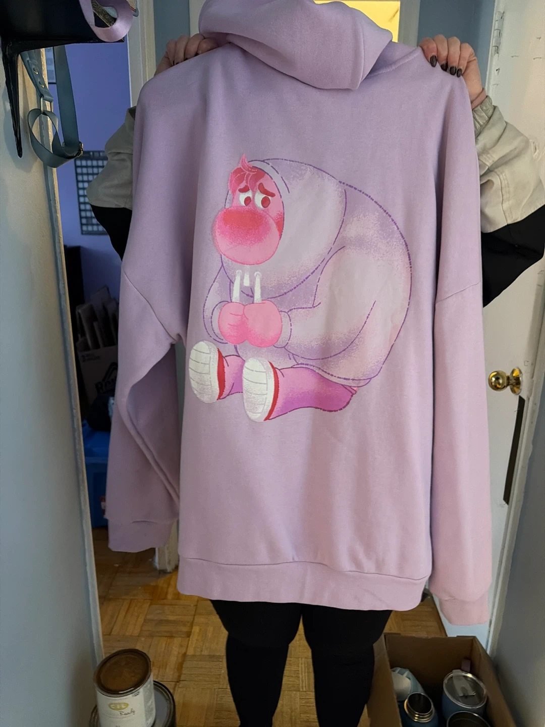 This zip-up hoodie is a fun lavender colour. It has "EMBARRASSMENT" embroidered on the front and a cute walrus graphic on the back. It's made of a soft material. This is a great piece for casual wear!