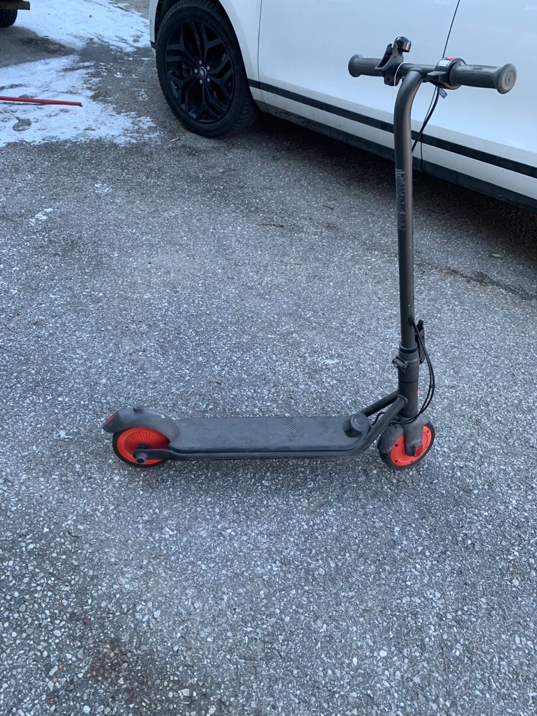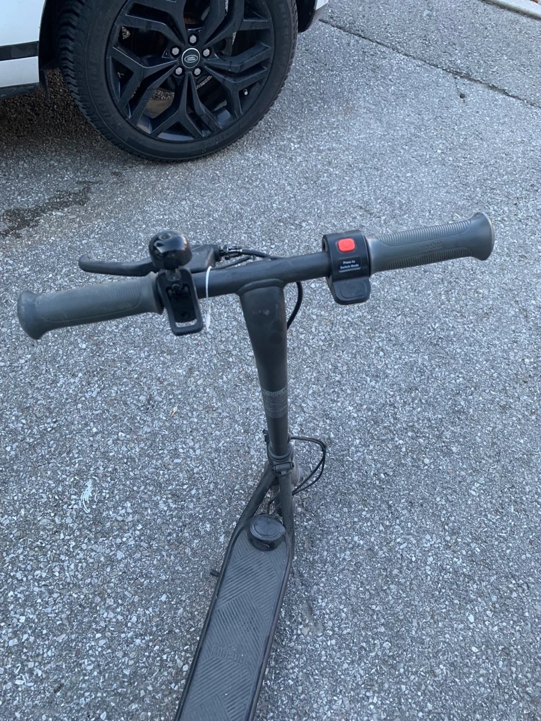 This Segway Ninebot electric kickscooter is black with red wheel accents. It's a great way to get around town. Foldable for easy storage and transport! Charger included.