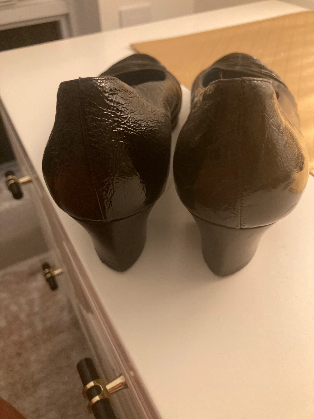 These elegant Thierry Rabotin heels are crafted from shiny black leather with a ruched detail on the toe. They feature a comfortable light blue interior. A classic addition to any wardrobe!