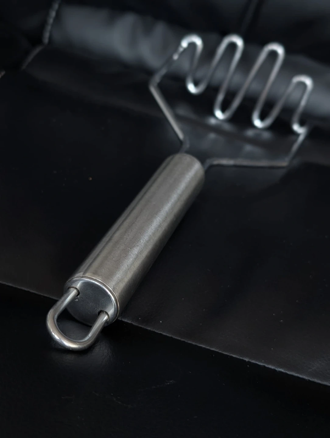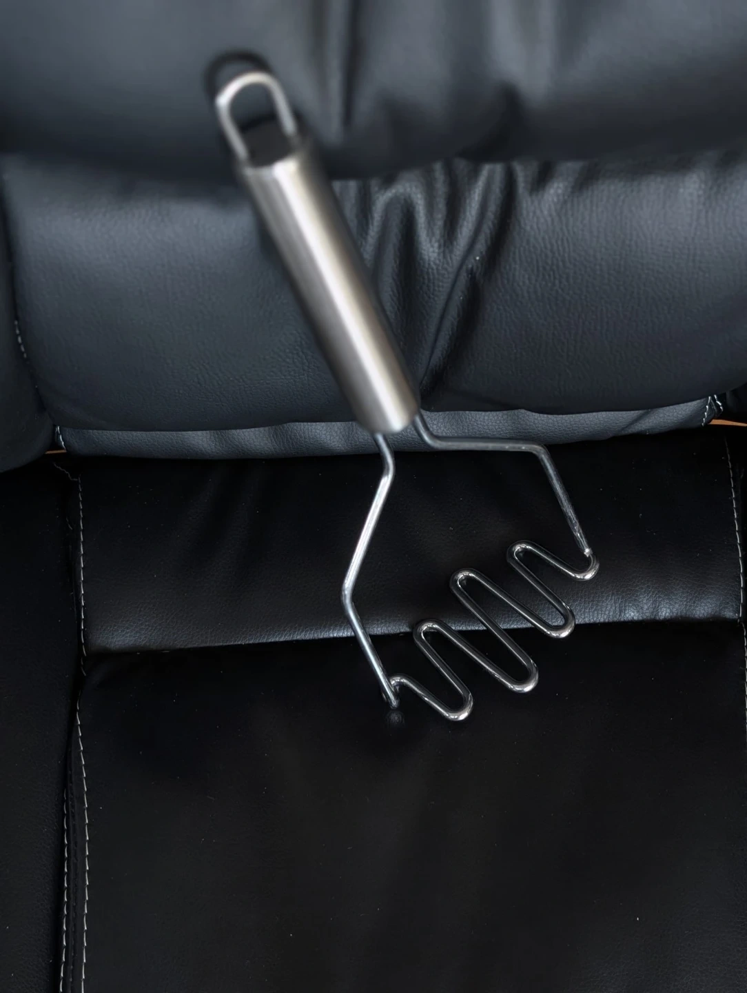 This is a gently used steel potato masher. It has a sturdy handle with a hanging loop. A kitchen essential for mashing potatoes and other soft foods!