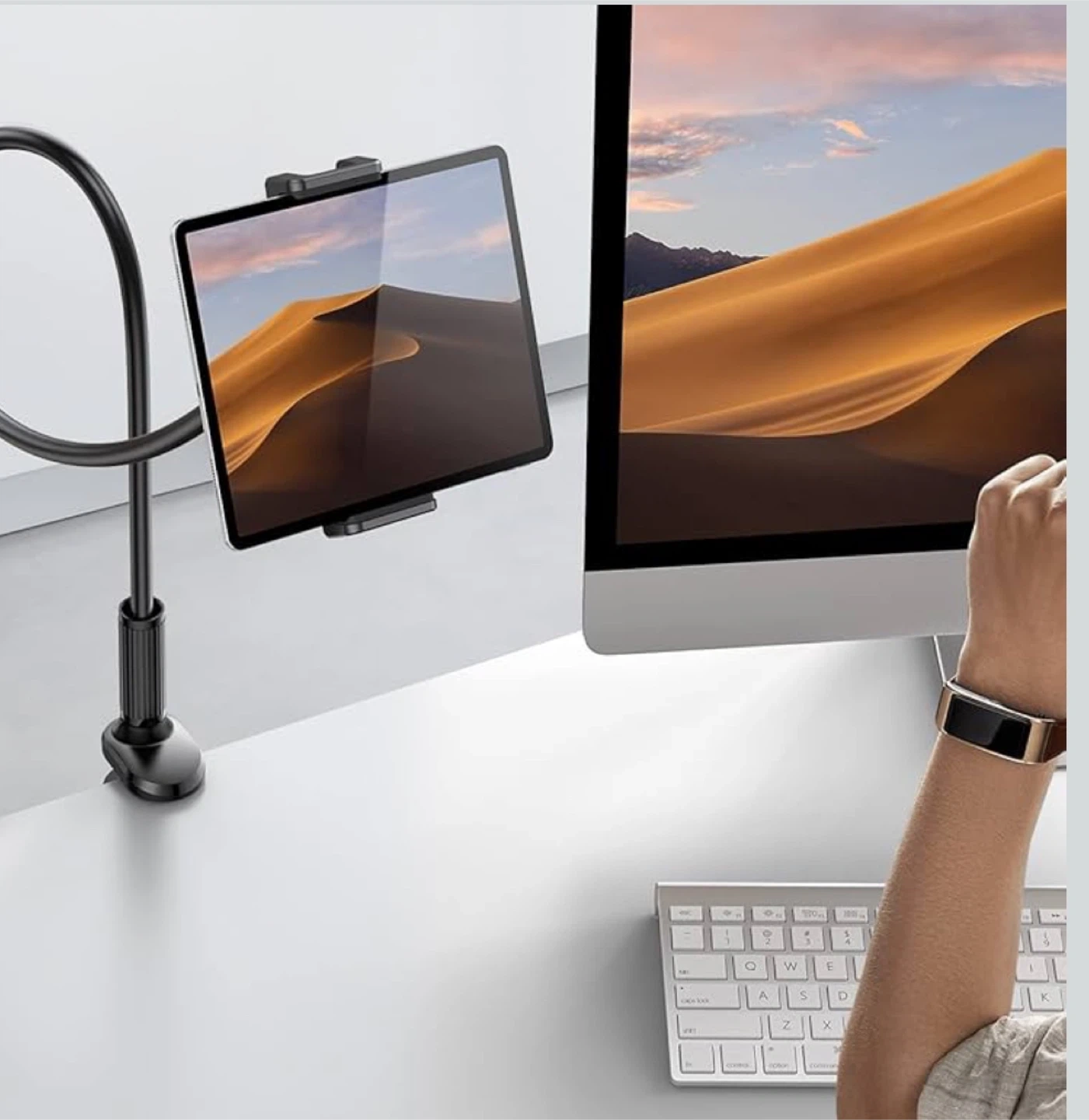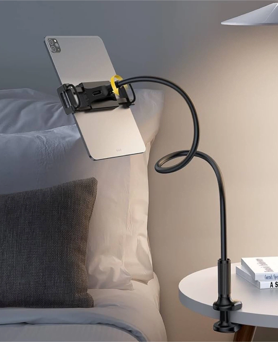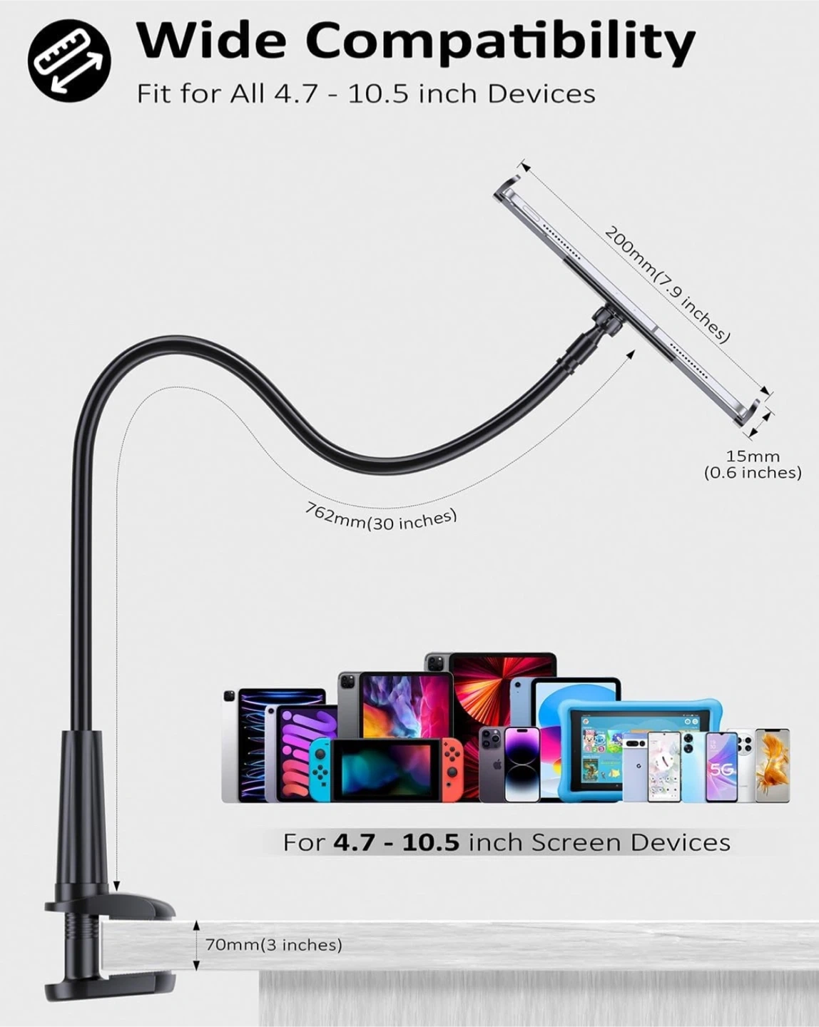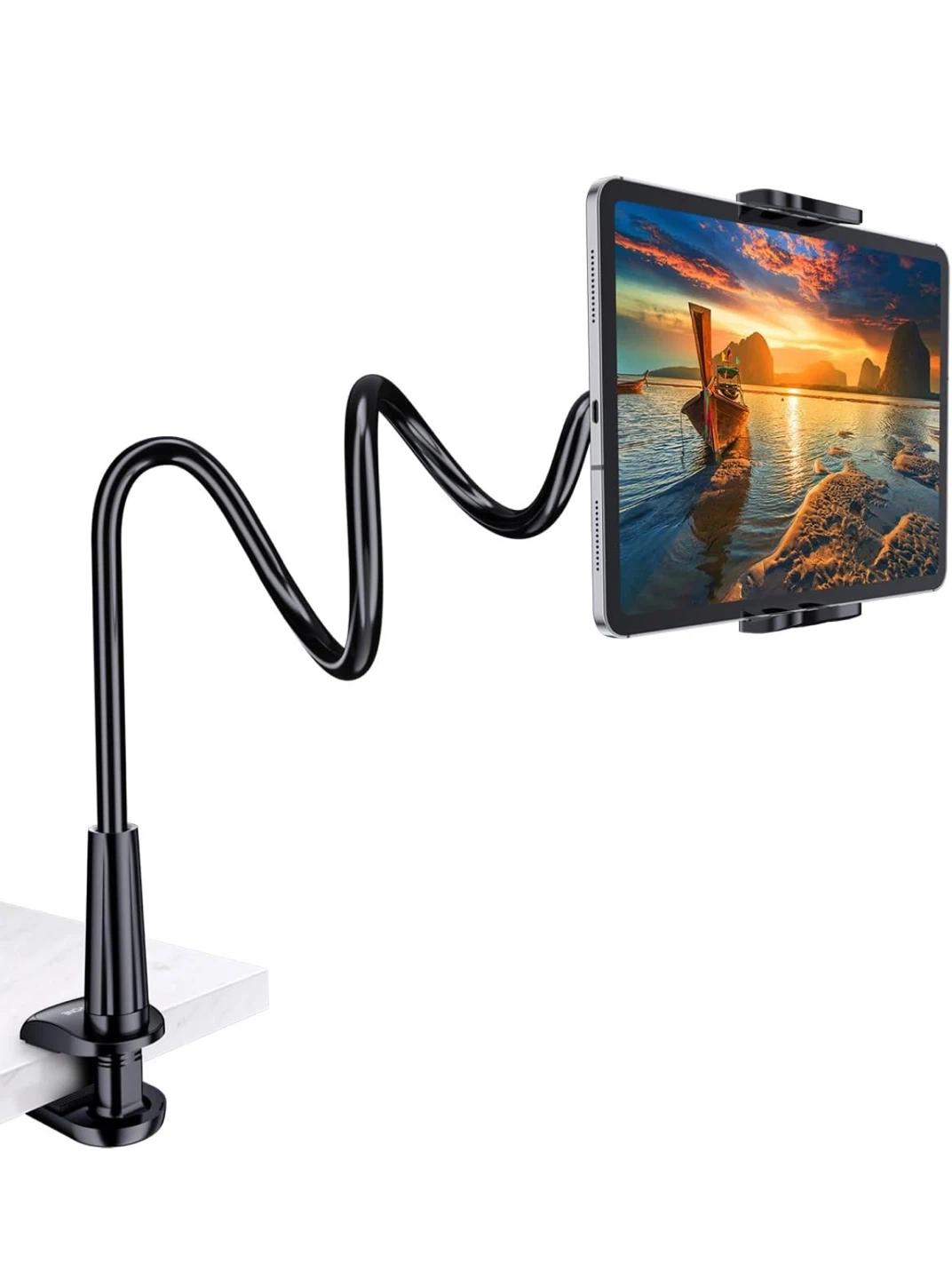 Tryone Gooseneck Tablet Holder Stand, designed to securely hold tablets ranging from 4.7 to 10.5 inches, featuring a flexible, adjustable gooseneck for optimal viewing angles, and a sturdy clamp for easy attachment to desks or beds.