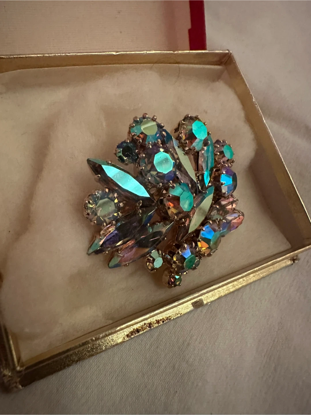Selling a vintage Aurora Borealis brooch! It features beautiful iridescent stones that catch the light wonderfully. A lovely piece to add to your collection!