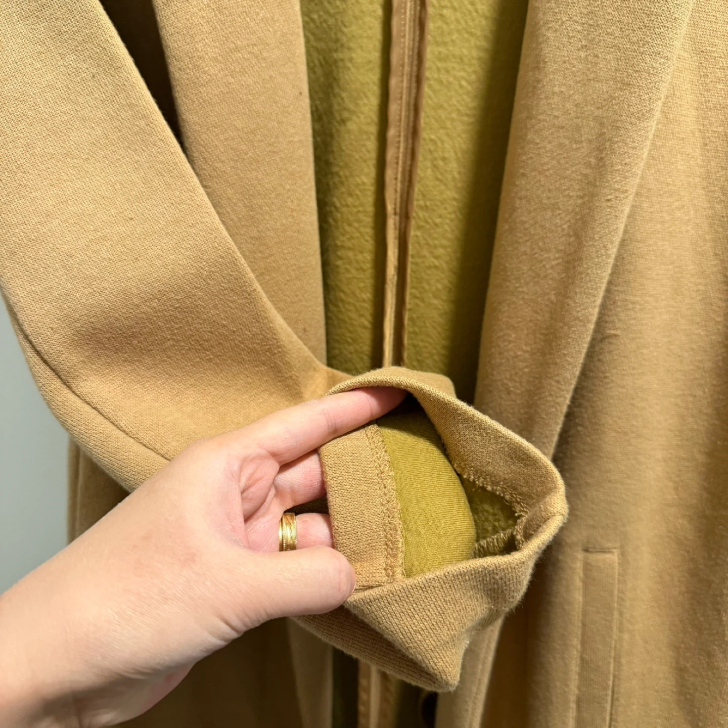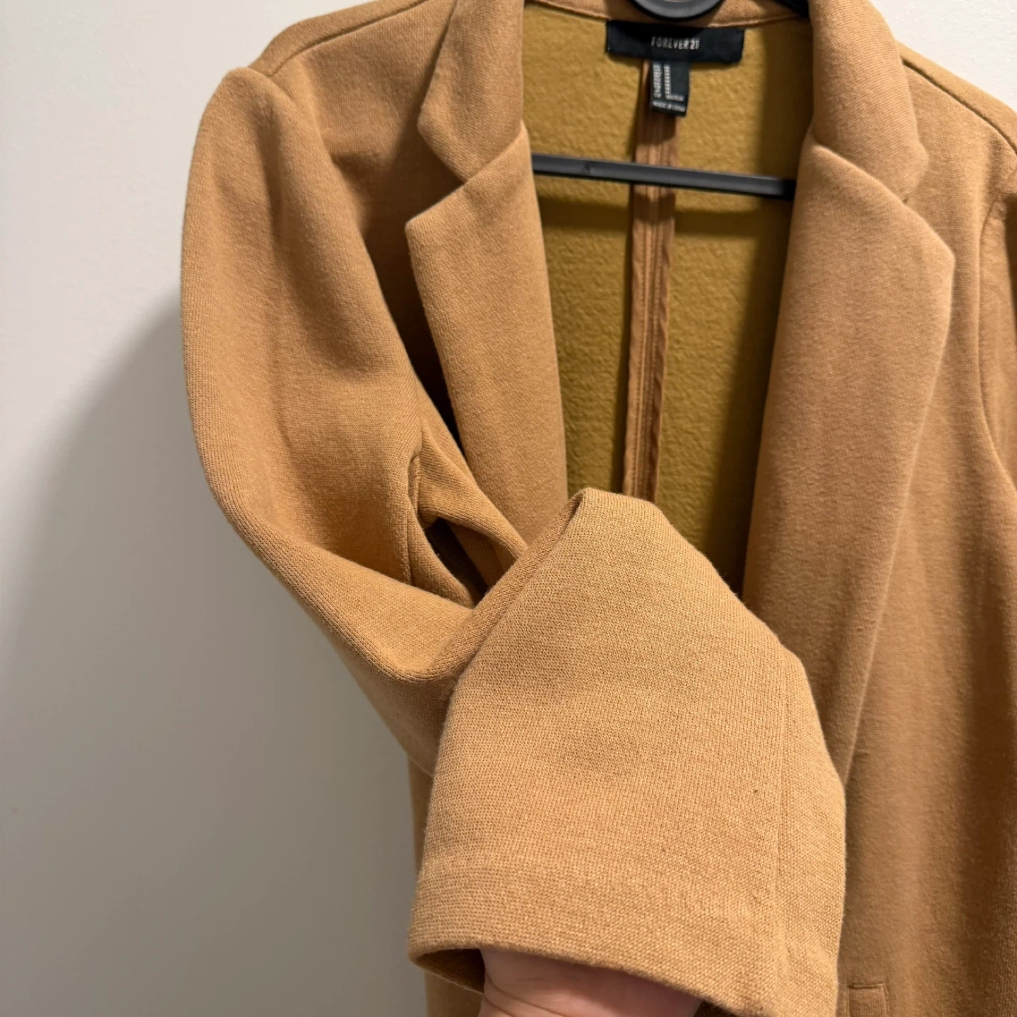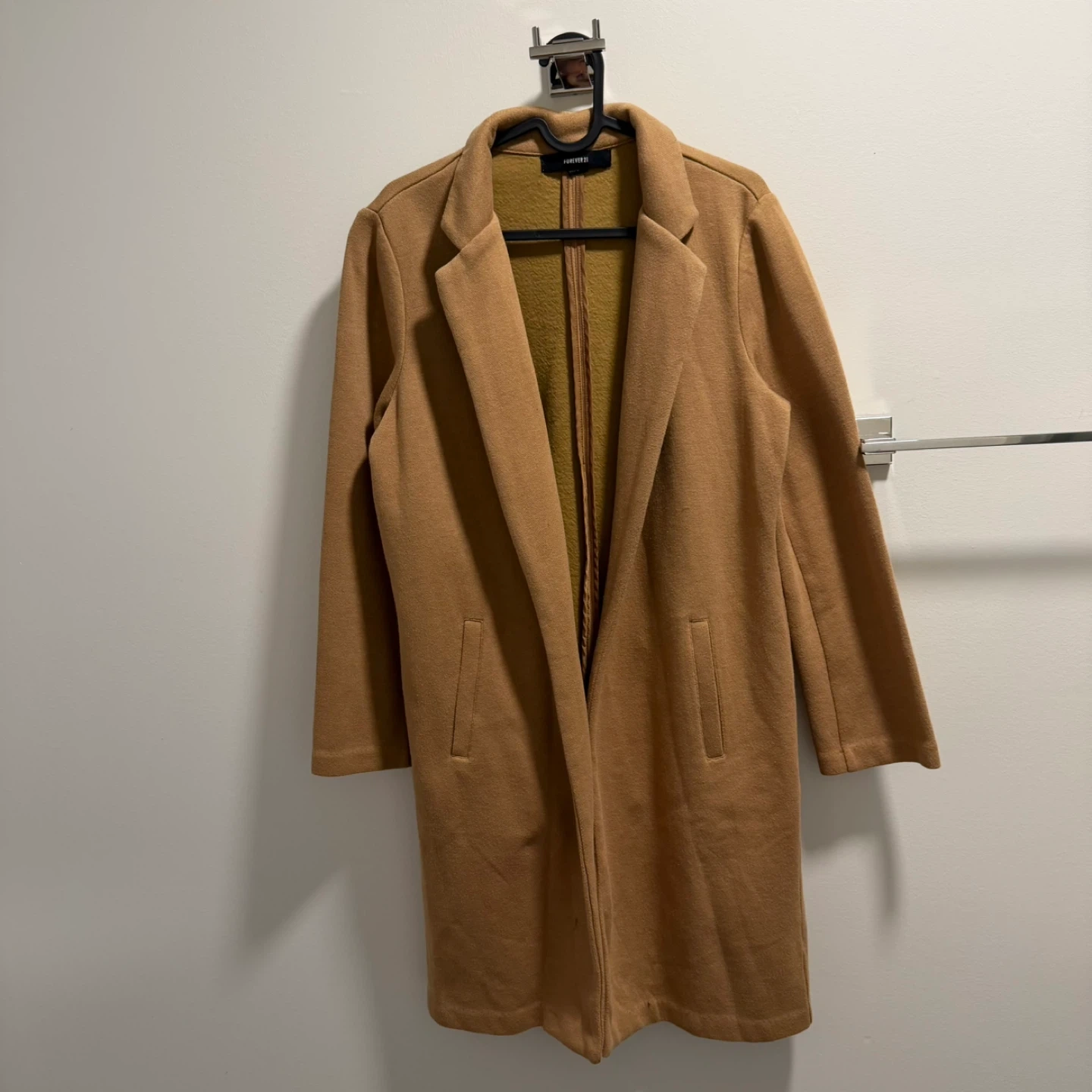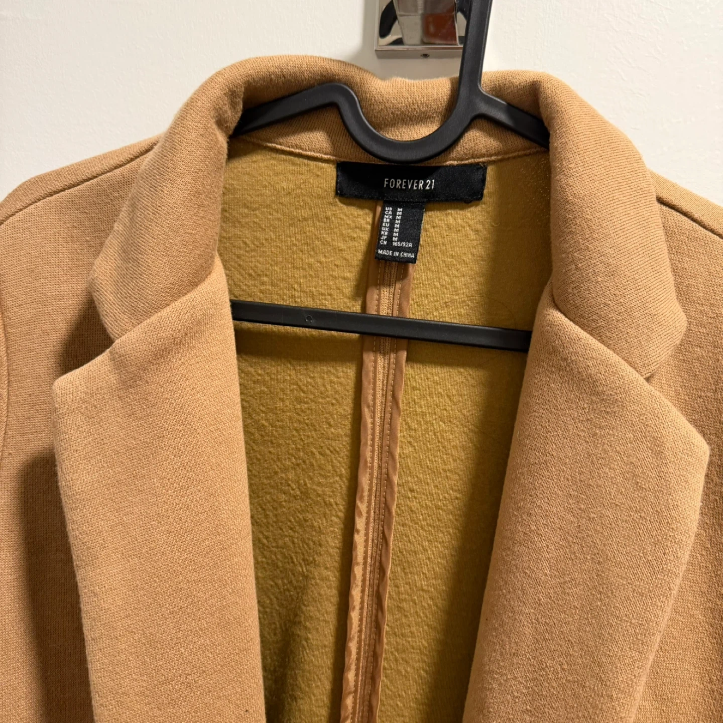 This is a Forever 21 camel-coloured coat. It's a women's size medium. Made of a soft fabric, it's perfect for cooler weather.