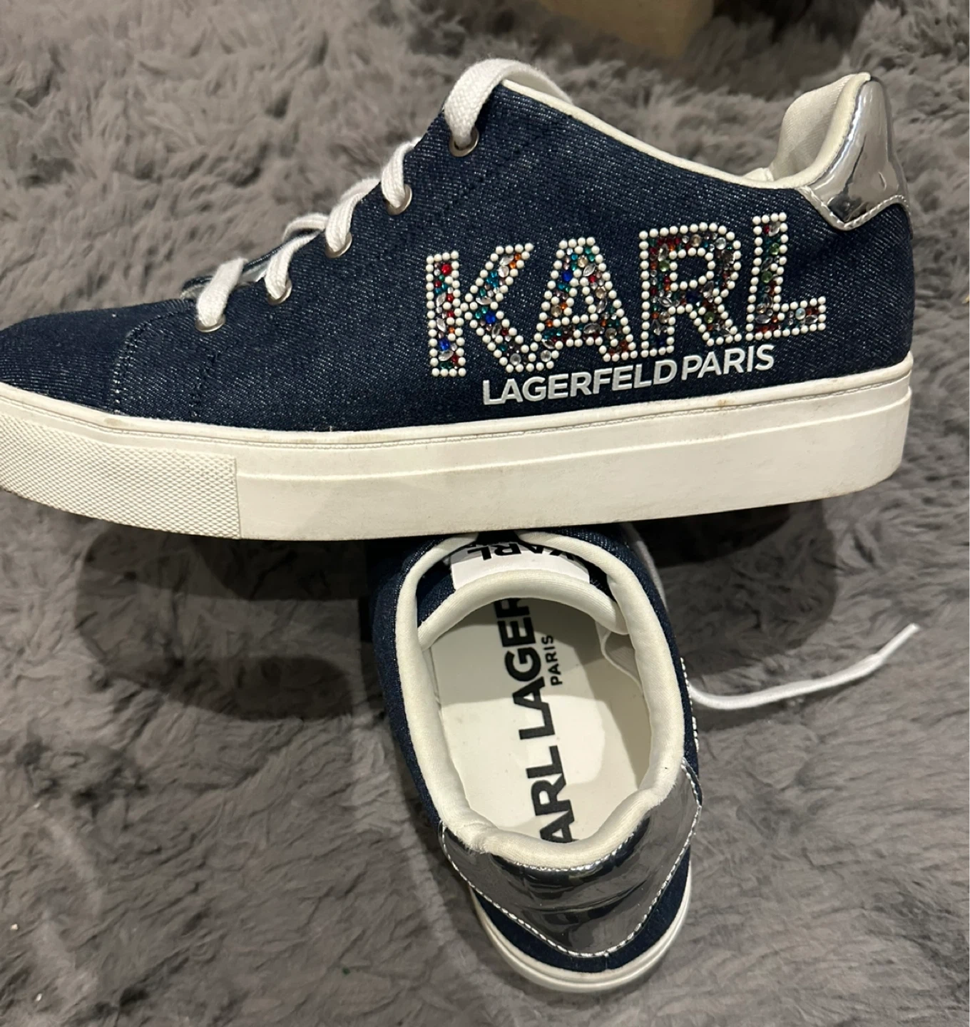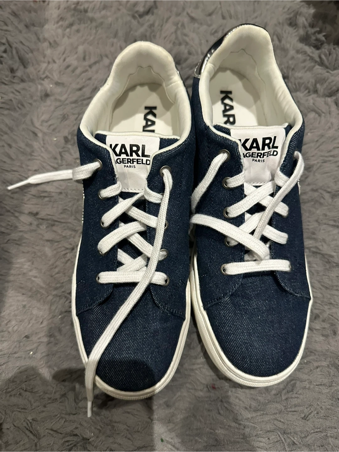 These Karl Lagerfeld Paris sneakers are made of denim. They feature white laces and silver accents on the heel. A stylish addition to any casual outfit!