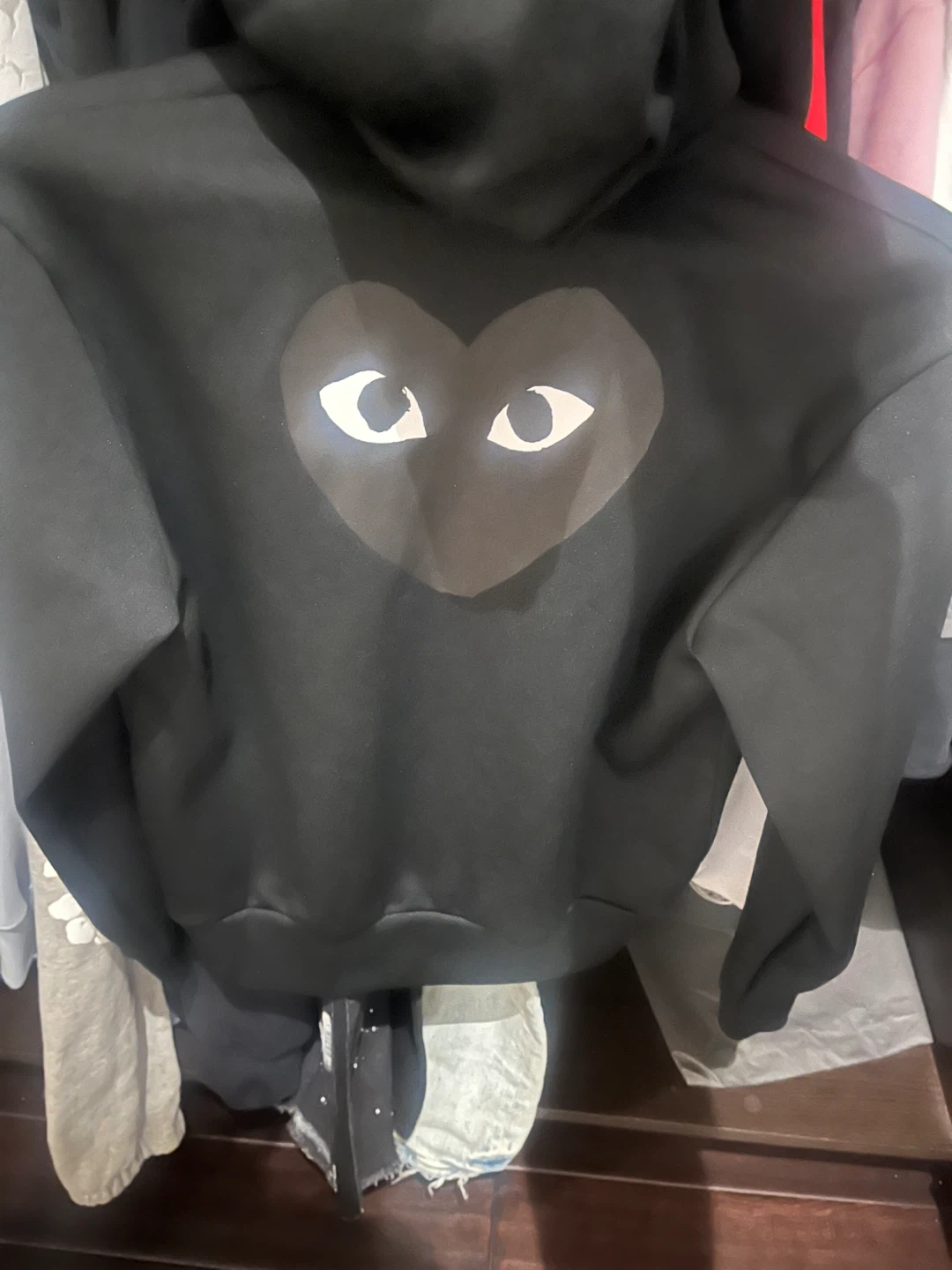 This is a black full-zip hoodie from Comme des Garçons PLAY. It features the iconic heart-and-eyes logo on the chest and a larger version on the back. Made with a soft material for comfort.