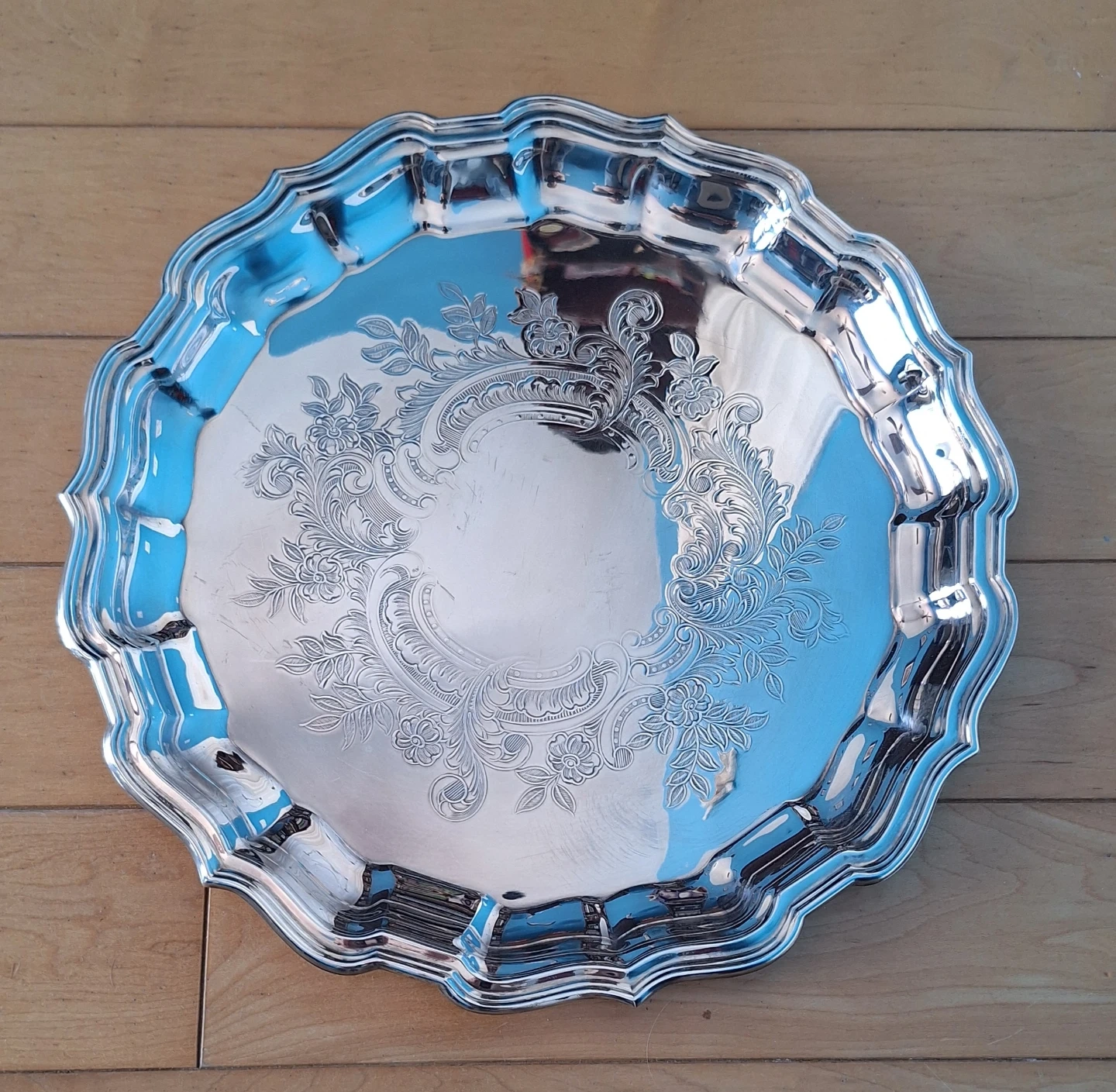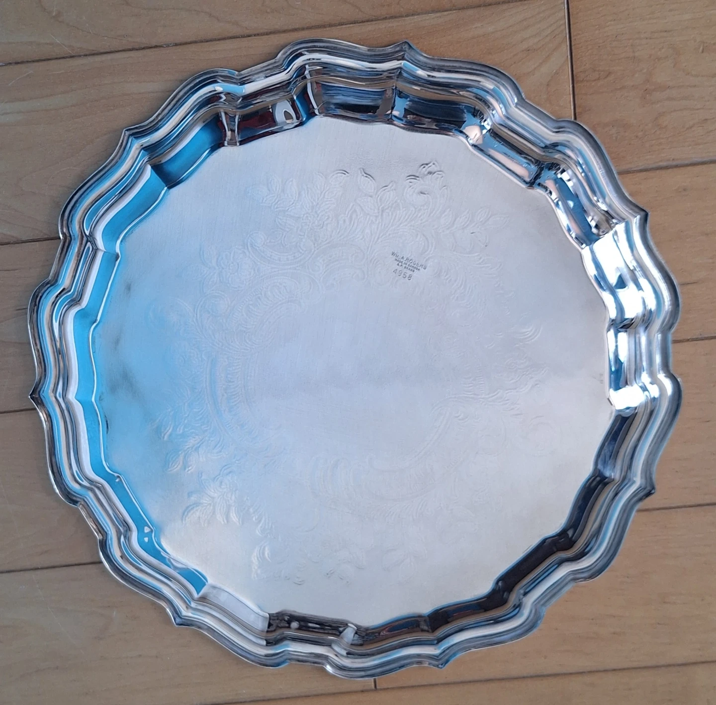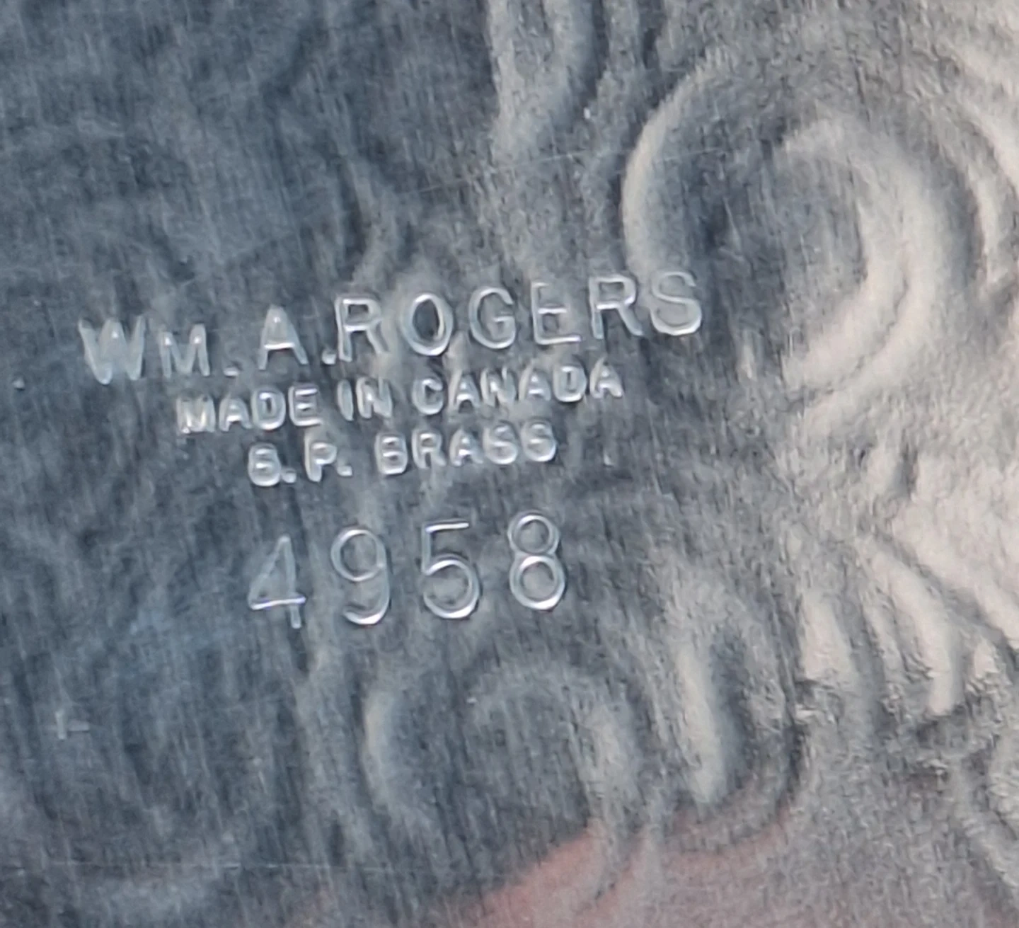 Serving tray made by Wm. A. Rogers. It's silver-plated brass with an ornate embossed floral design. 12 inches diameter