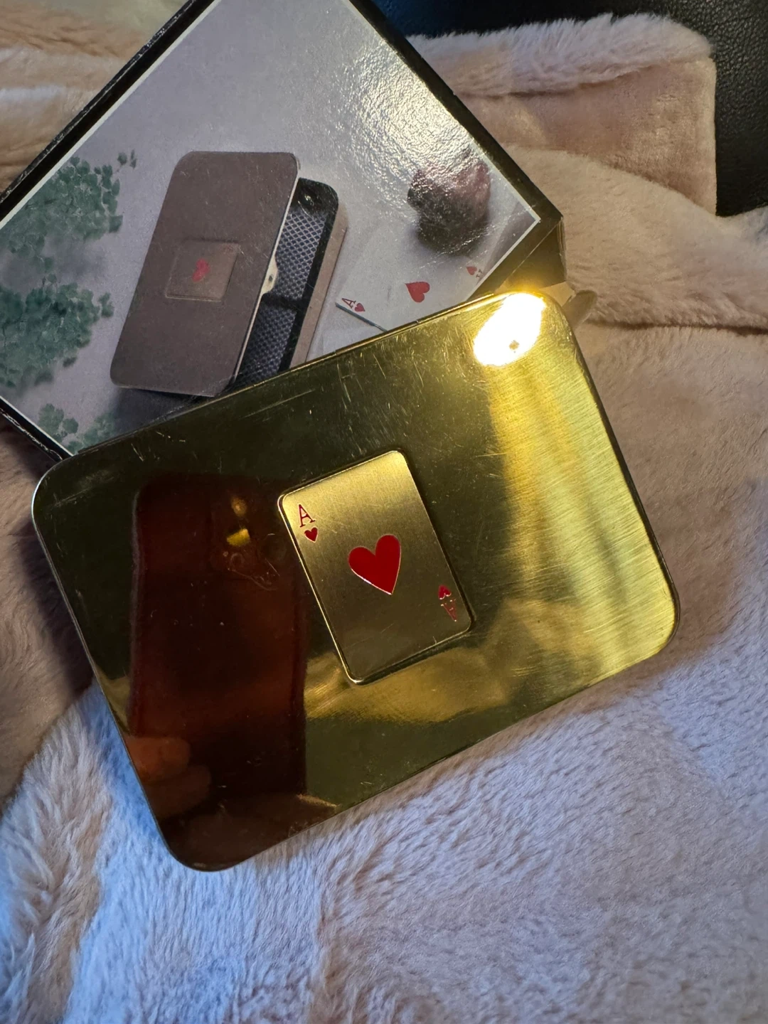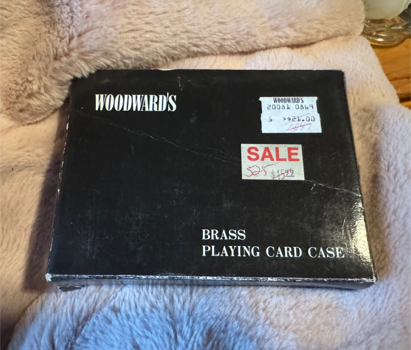 This is a brass playing card case from Woodward's. It's designed to hold a deck of cards and comes with dividers inside. The case has a decorative Ace of Hearts design on the lid. It's a handy accessory for keeping your cards protected!