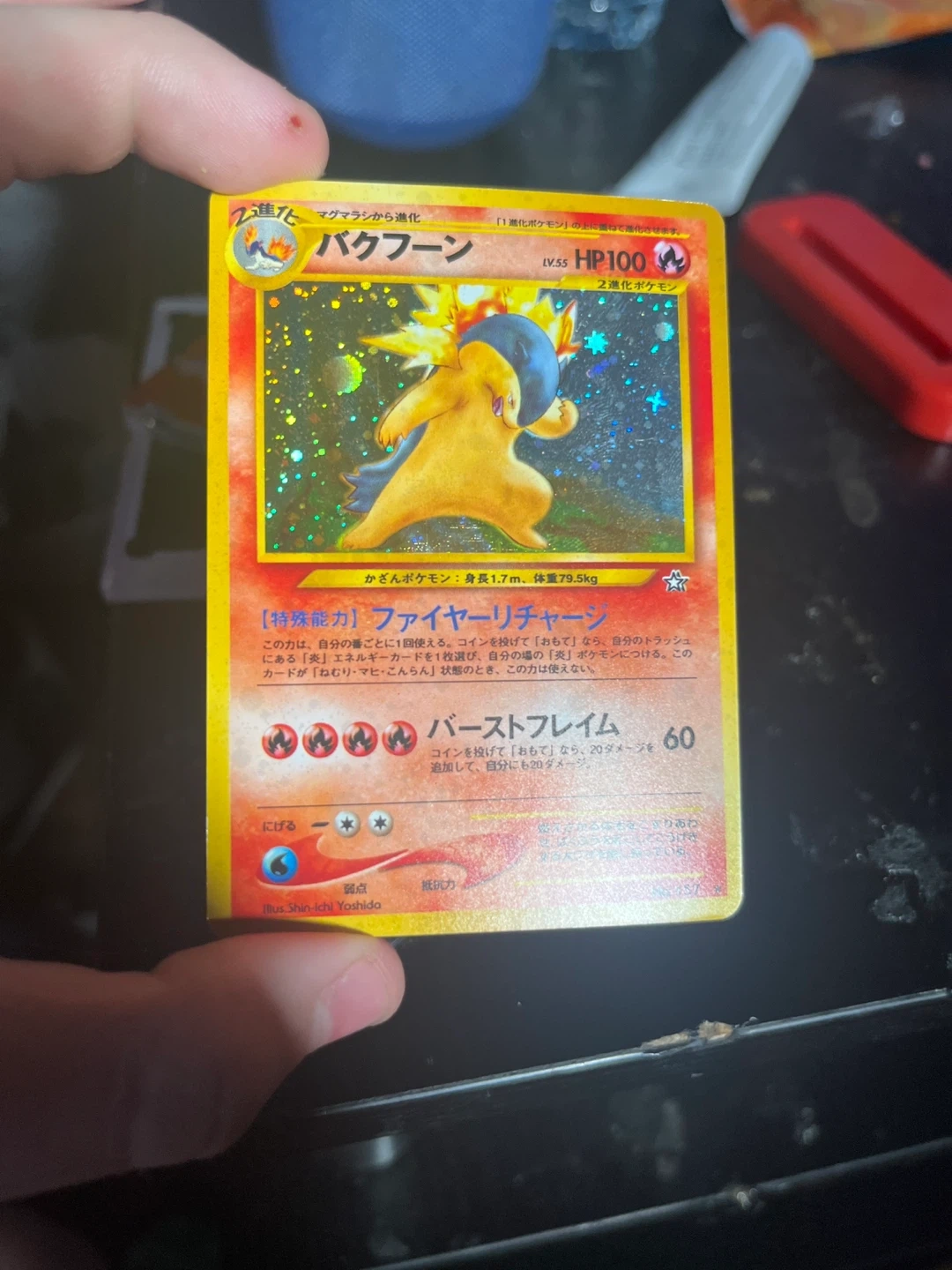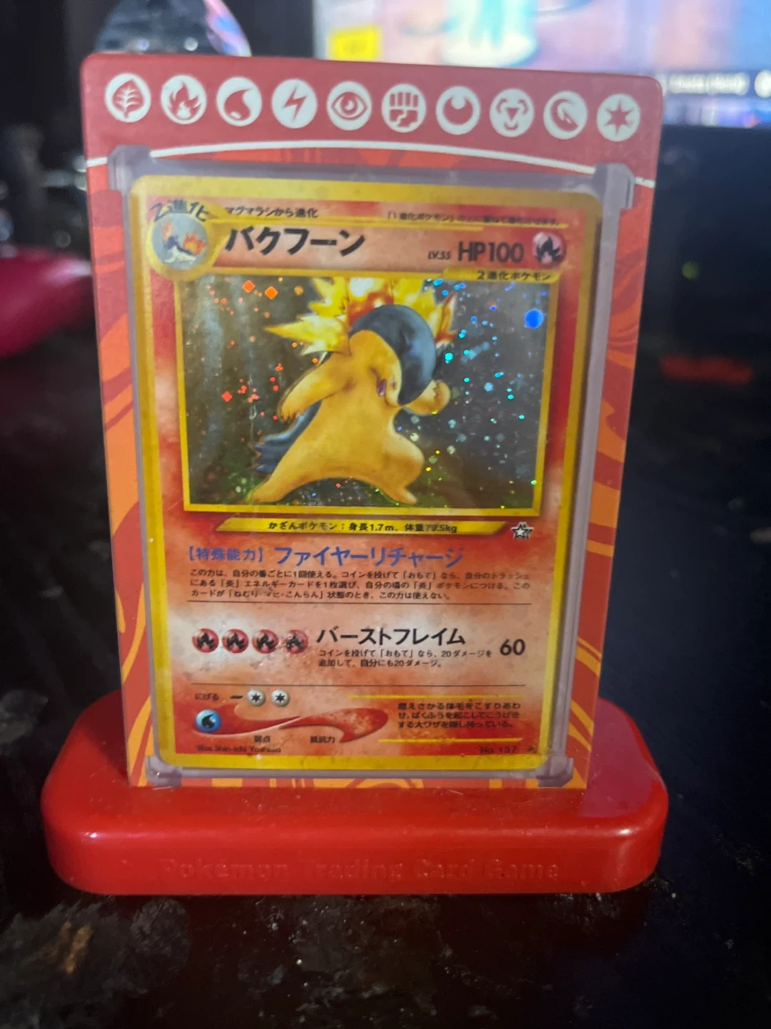 Selling a Typhlosion Pokemon card. It's in good condition and ready for a new home! Perfect for any collector or Pokemon enthusiasts and includes the stand with case and nagotions are available
