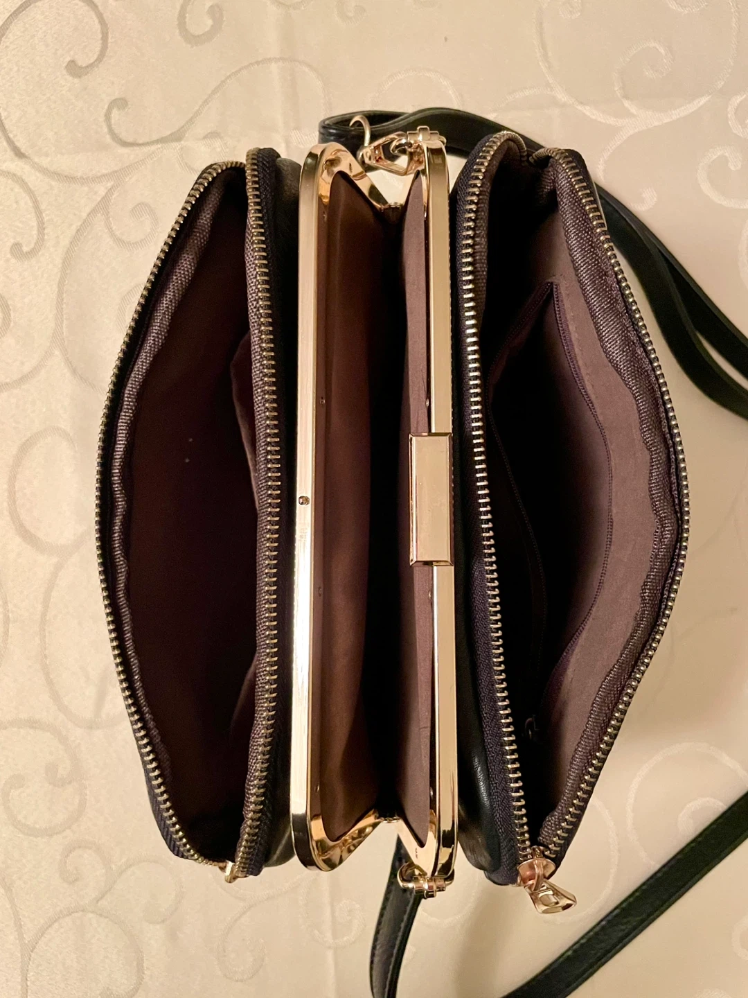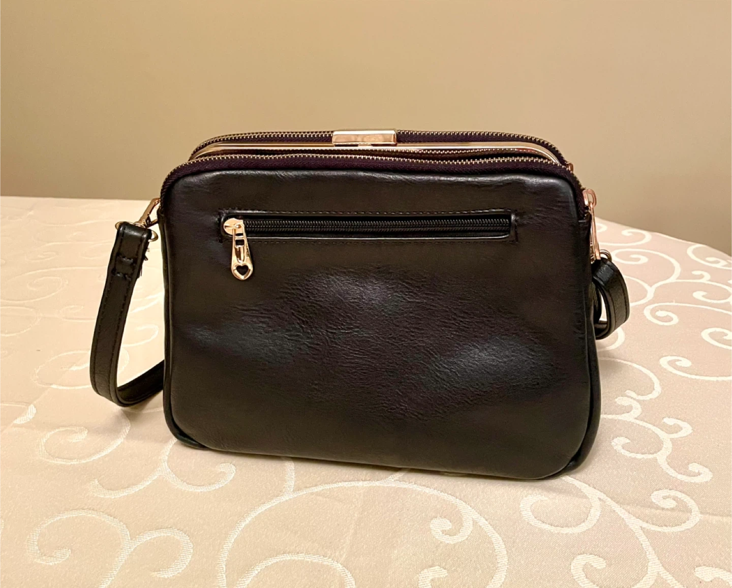 Three clean spacious compartments with inner zip pocket and a slip pocket are designed for you to keep your cash, credit cards, makeup, travel cards and smartphones organized well. Thereβs an extra zip compartment at the back of the bag.