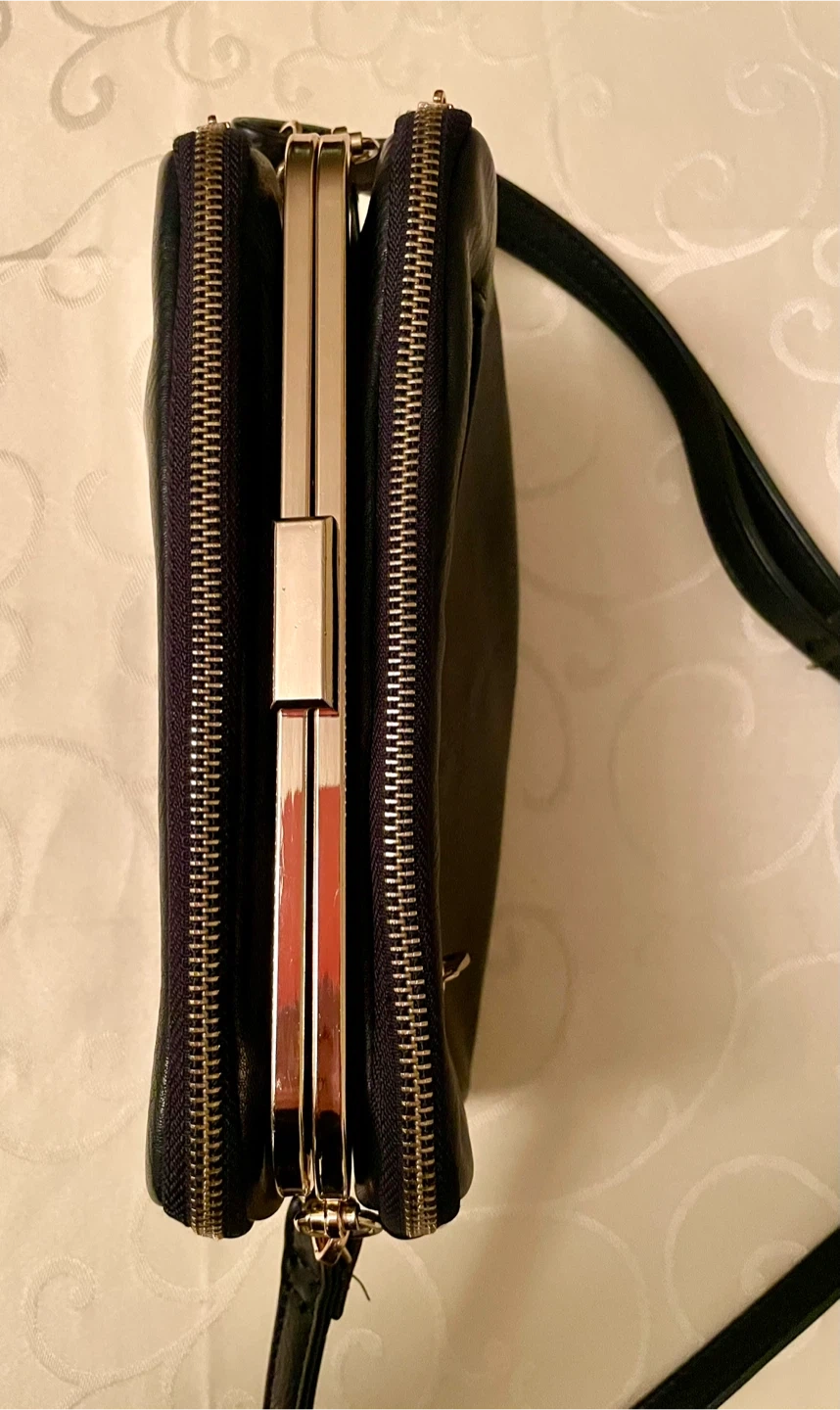 High quality womenβs Long & Son black faux leather handbag with gold accents.