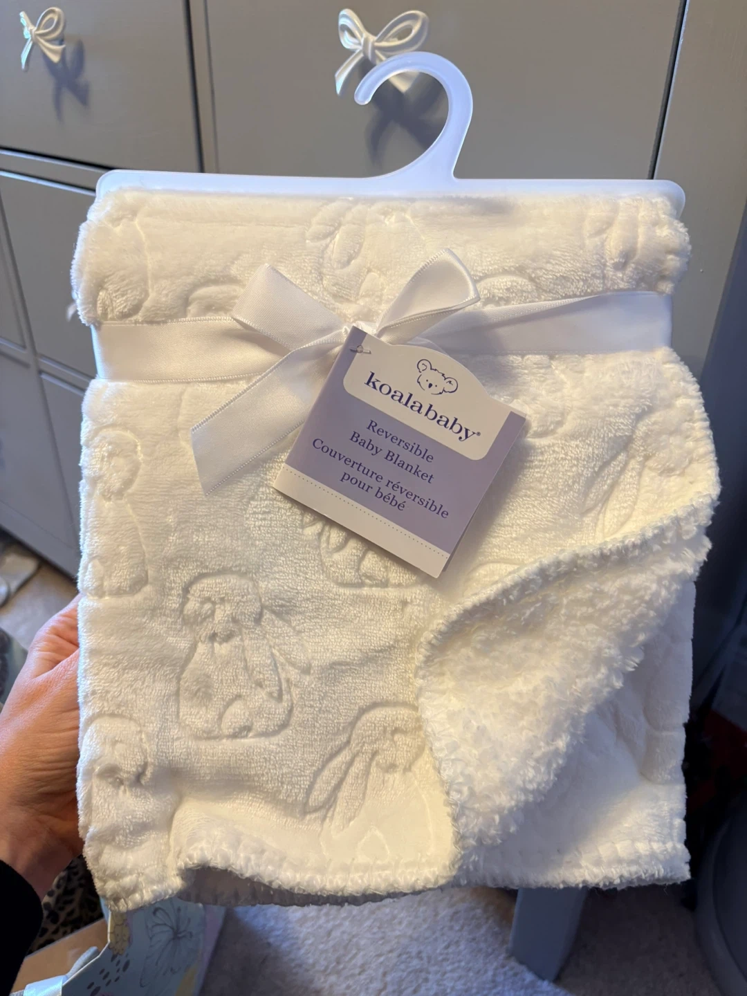 This is a white, reversible baby blanket from Koala Baby. It's made from 100% polyester and measures 30 in. x 36 in. (76 cm x 91 cm). Machine wash and dry.