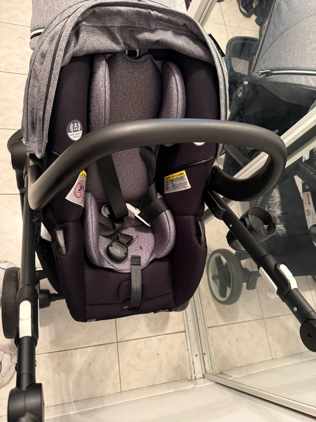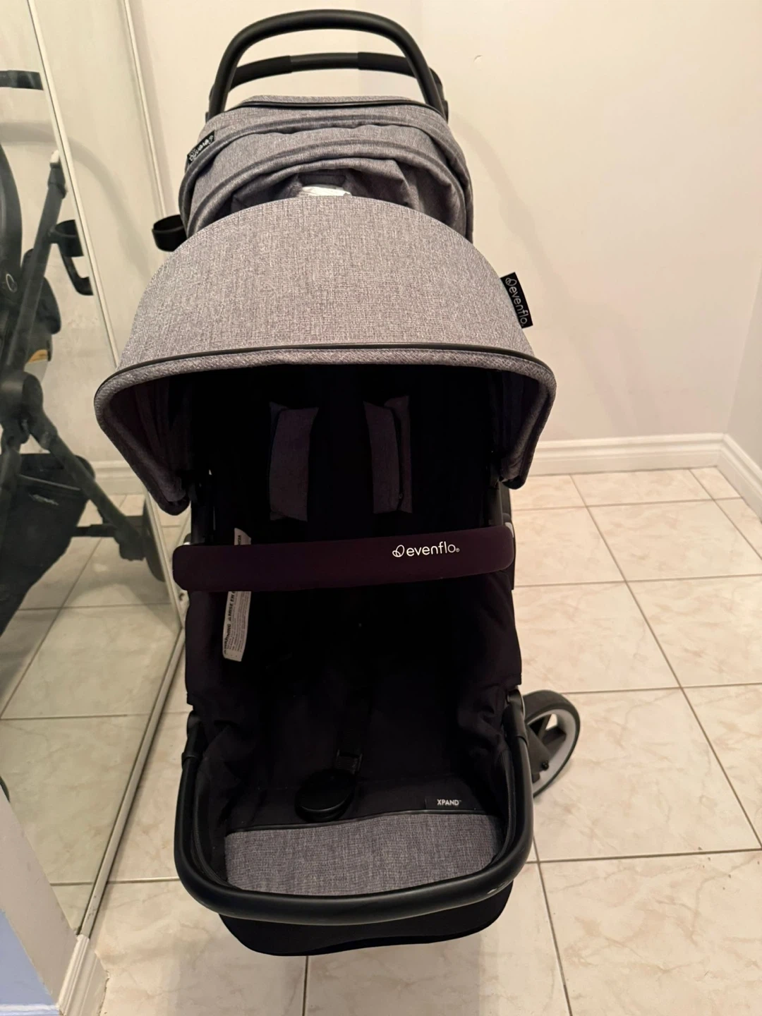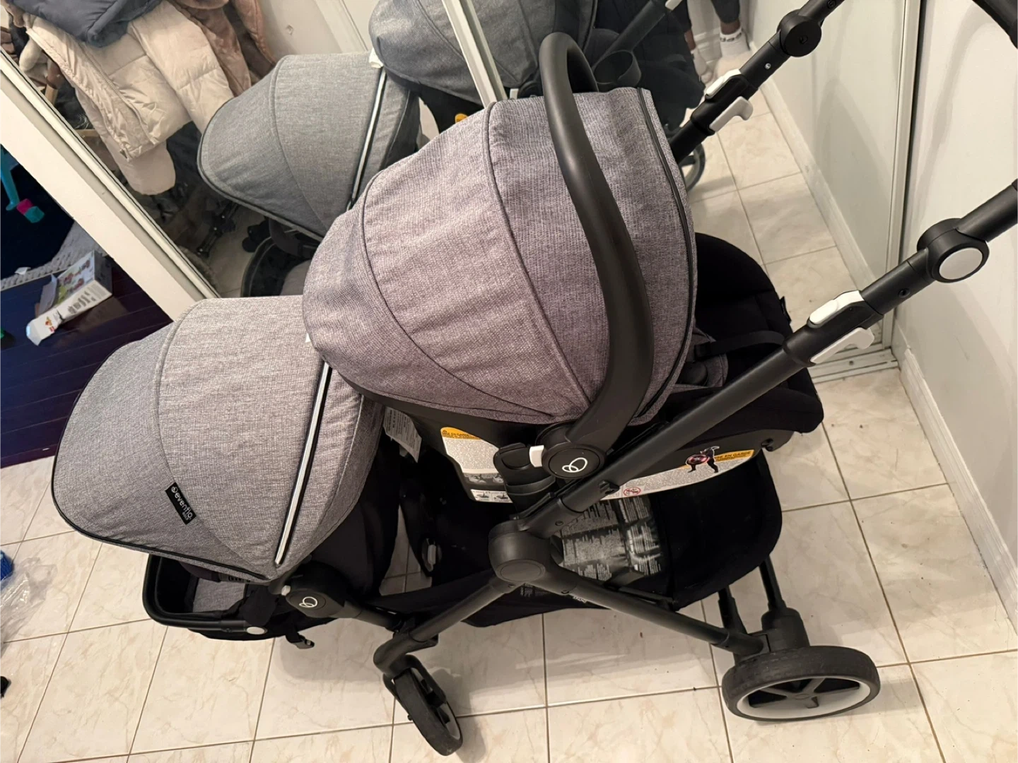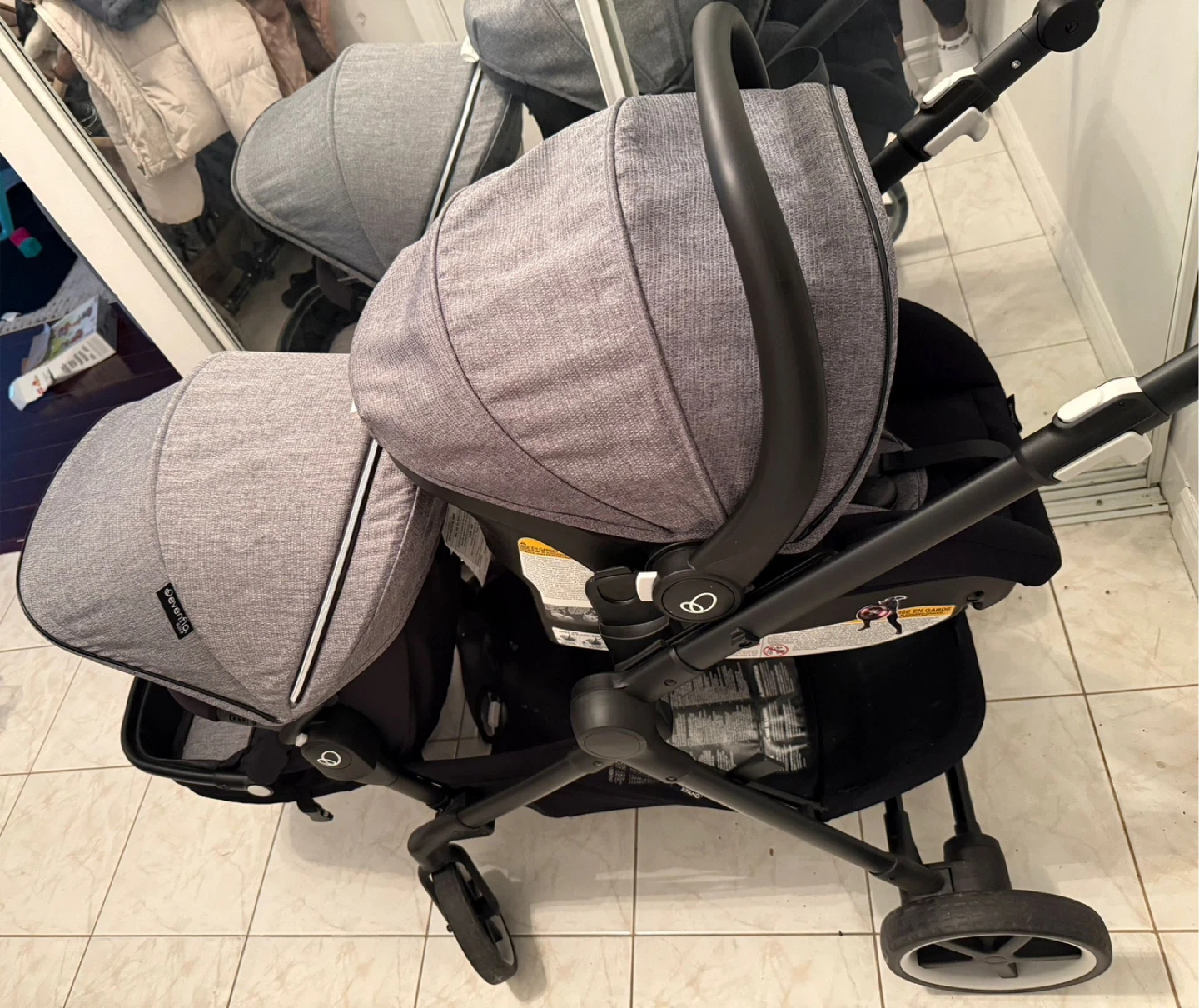 An Evenflo gold sensor safe pivot expand smart travel system with infant car seat. It has 2 seats for both a baby and a toddler at the same time. Still new and only used for 2 months.