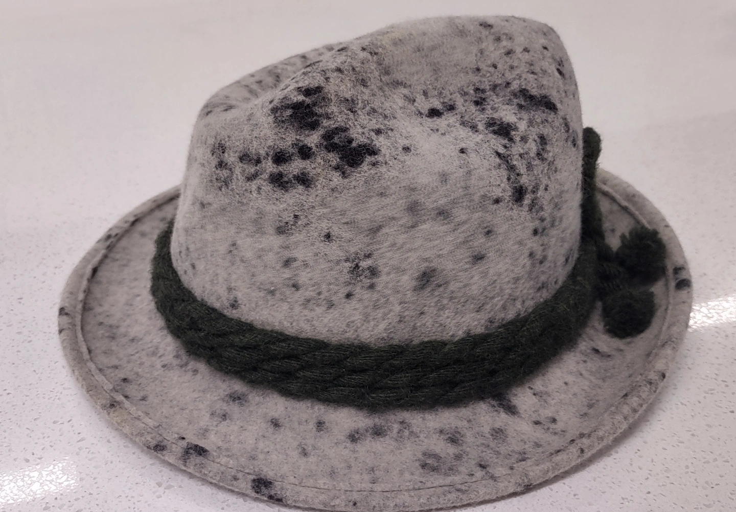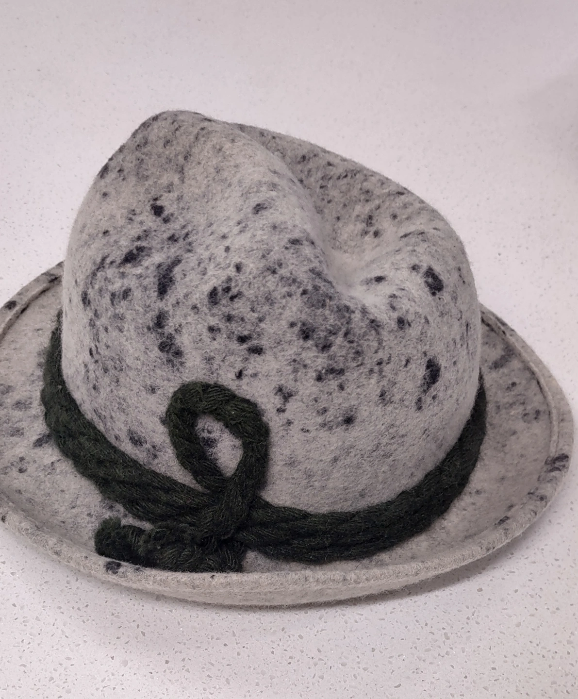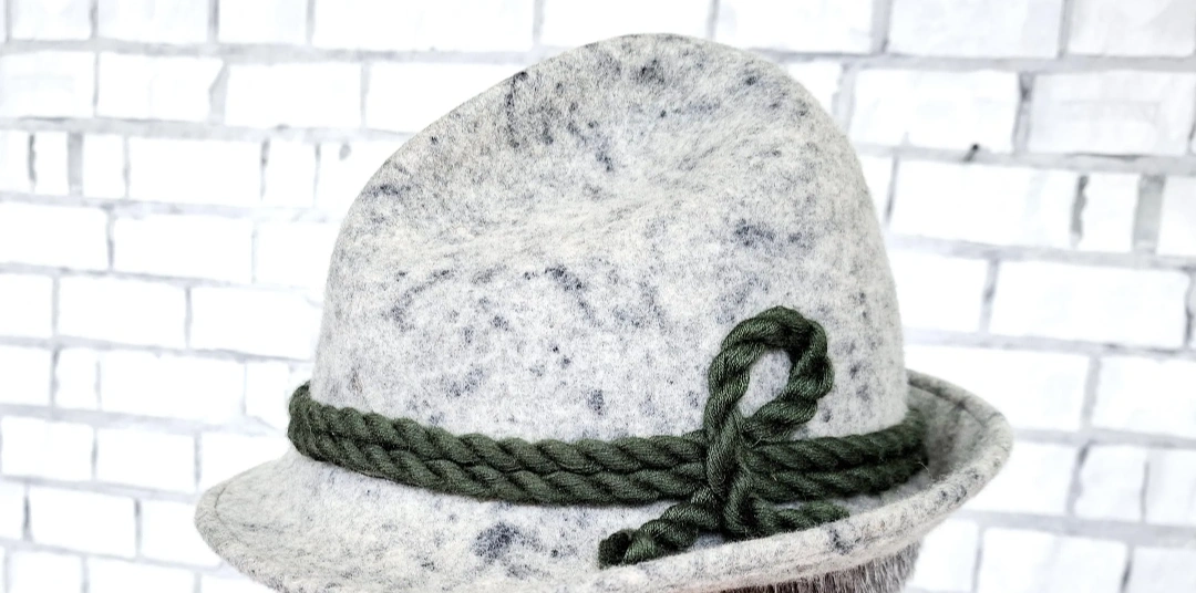 1000+Grey felt Tyrolean hat. Features a green rope band and feather detail. Pocket Felt Wool, Grey, HUTTER, Size 55 small size
