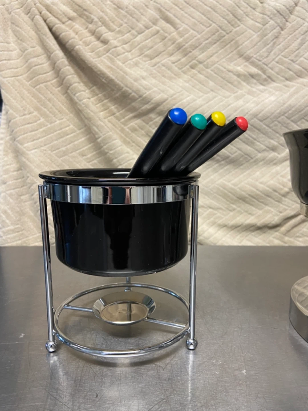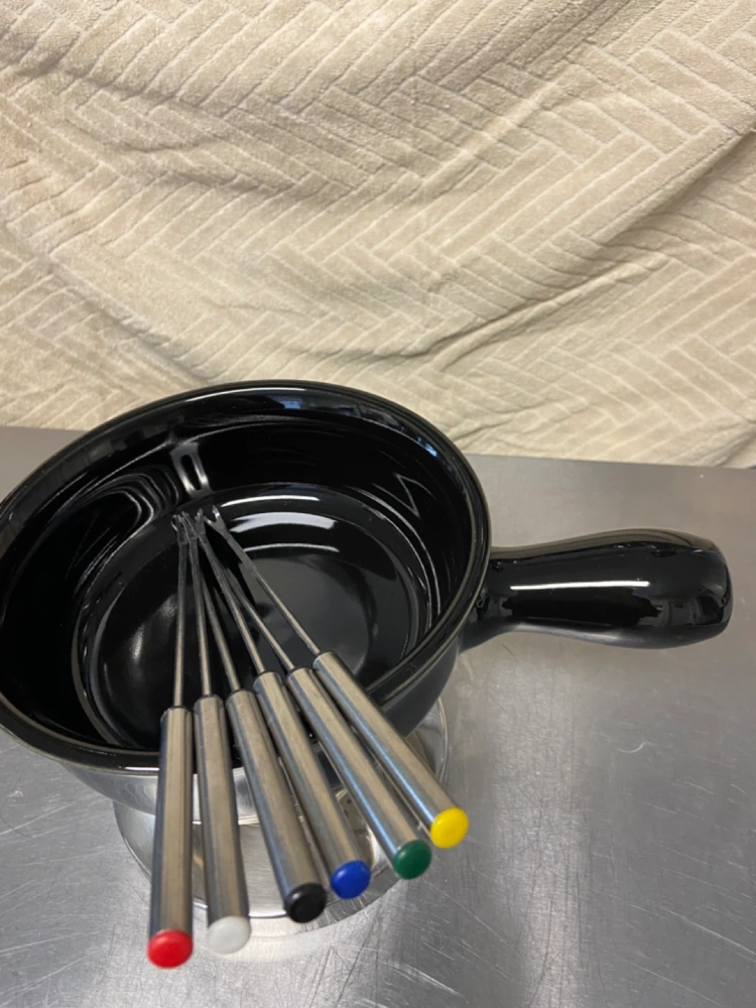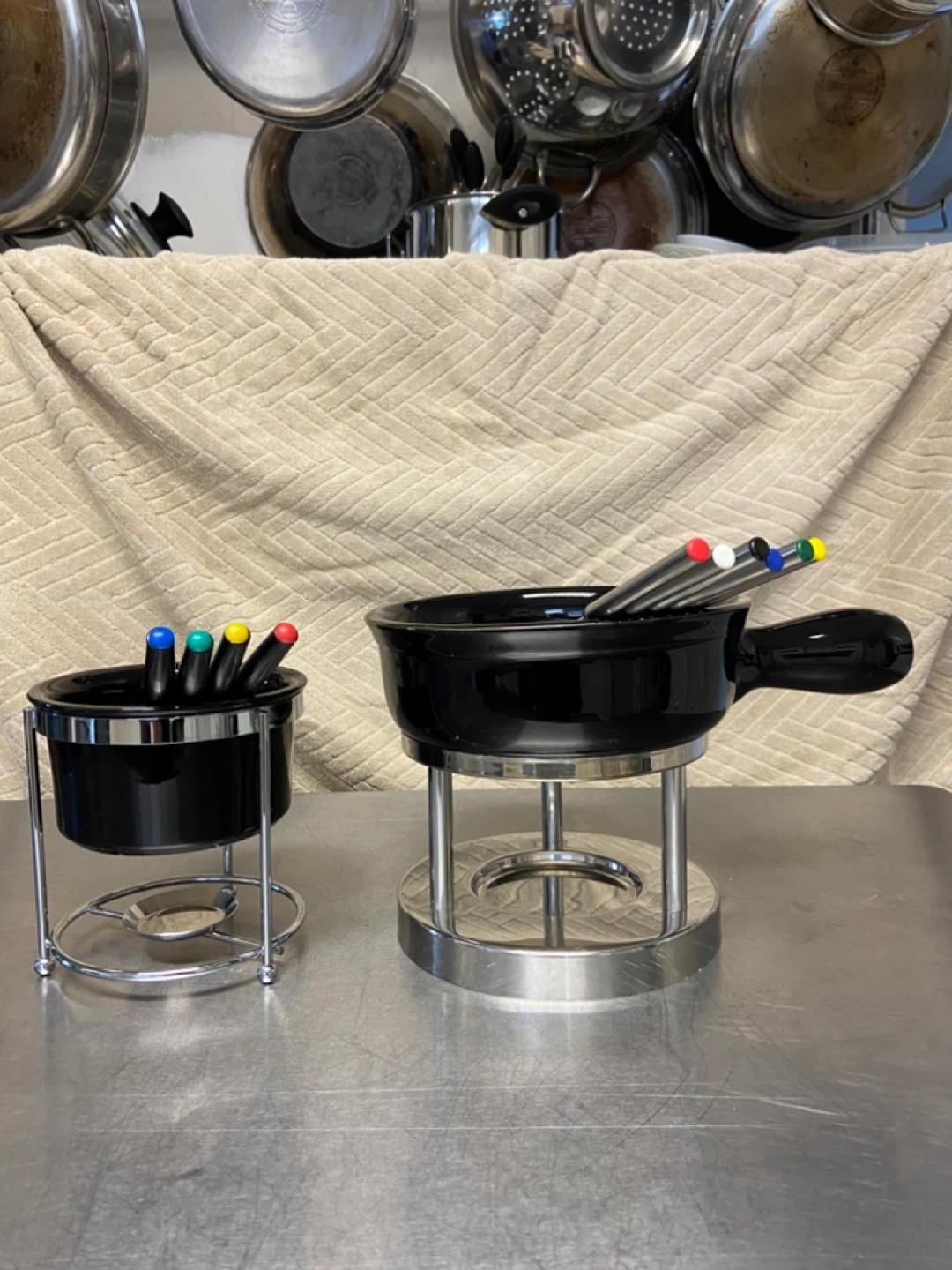 2 Ceramic Fondue Sets: Chocolate and Cheese/Broth sets including 4 and 6 forks. Black Ceramic Pots and Stainless Steel Frames. Forks have coloured tips. Great for melting cheese or chocolate!
