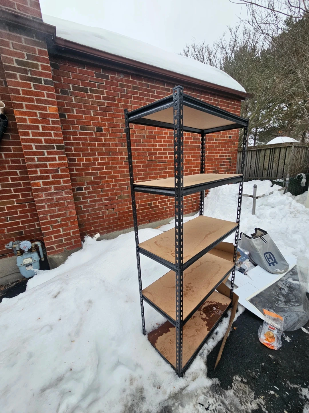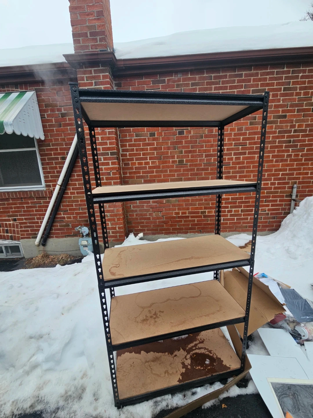 This metal shelving unit has five sturdy shelves. It's made with a black metal frame and particle board shelves. Great for organizing garages or basements!