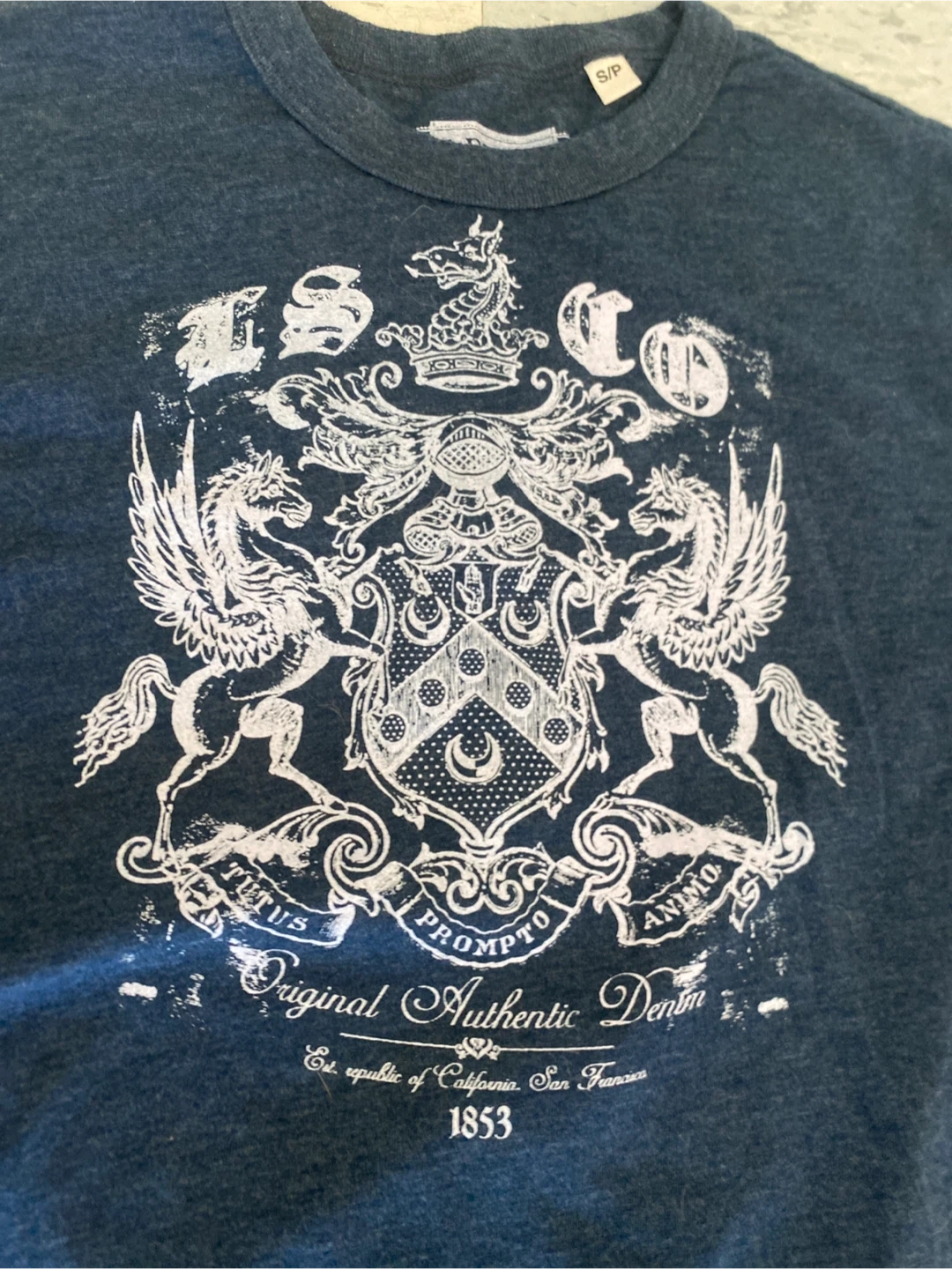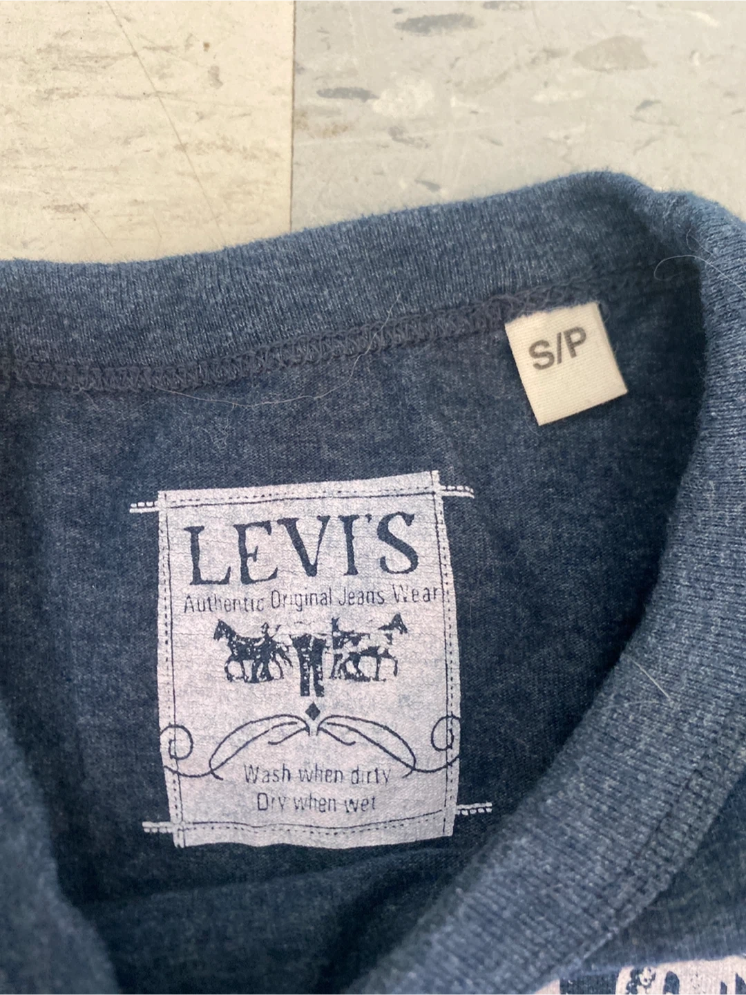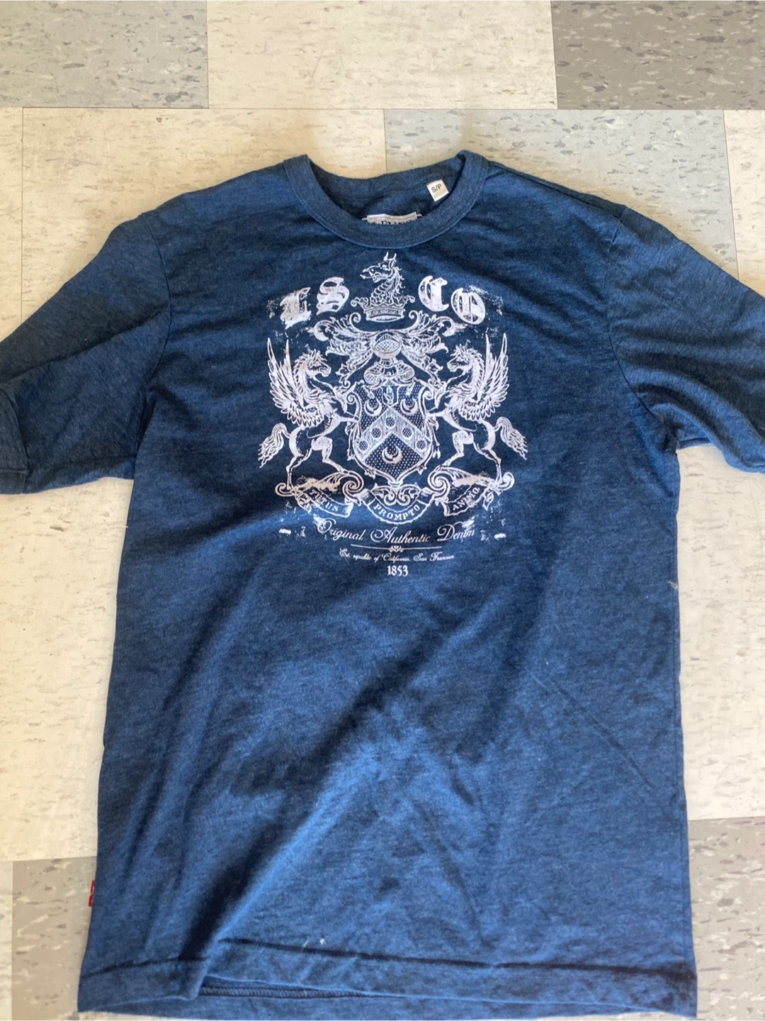 This is a vintage Levi's blue t-shirt with a graphic print. It's a size small but fits up to medium. Cotton material.