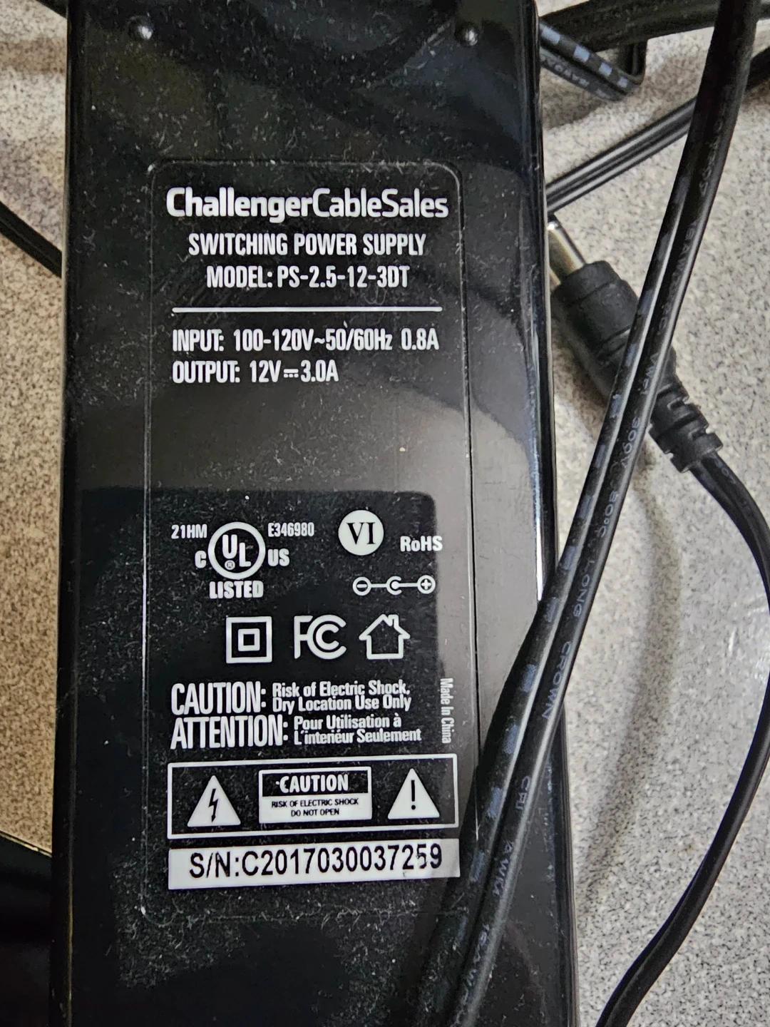 ChallengerCableSales switching power supply. Model PS-2.5-12-3DT. Input is 100-120V~50/60Hz 0.8A. Output is 12V === 3.0A. Made in China.