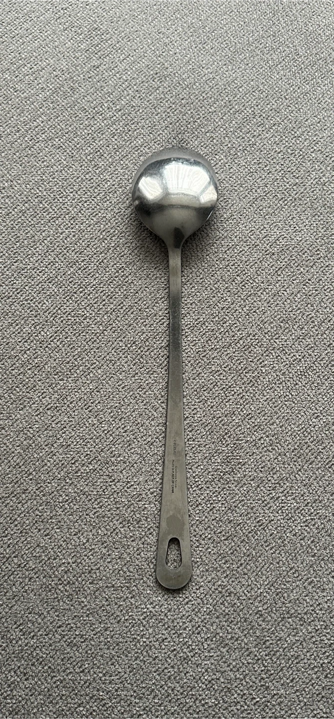 A stainless steel ladle spoon. Perfect for serving soups or sauces. It's made of durable stainless steel.