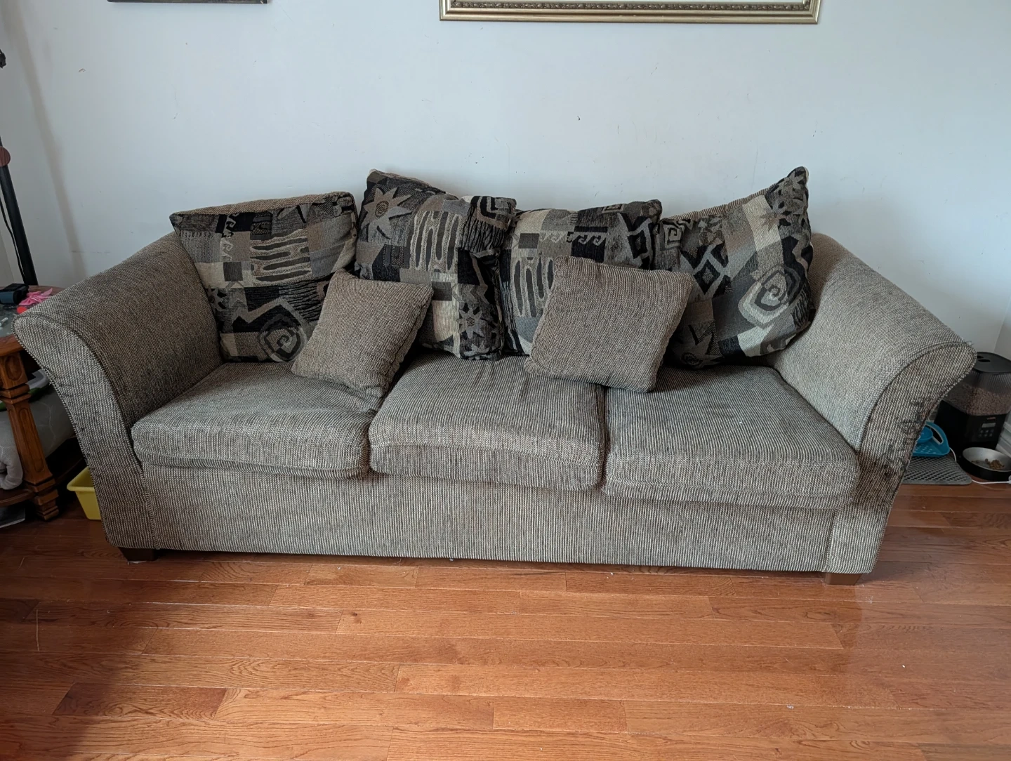 Three-seater sofa in a neutral brown textured fabric. It comes with a set of decorative throw pillows in various patterns. Upholstered sofa with plush seating.
