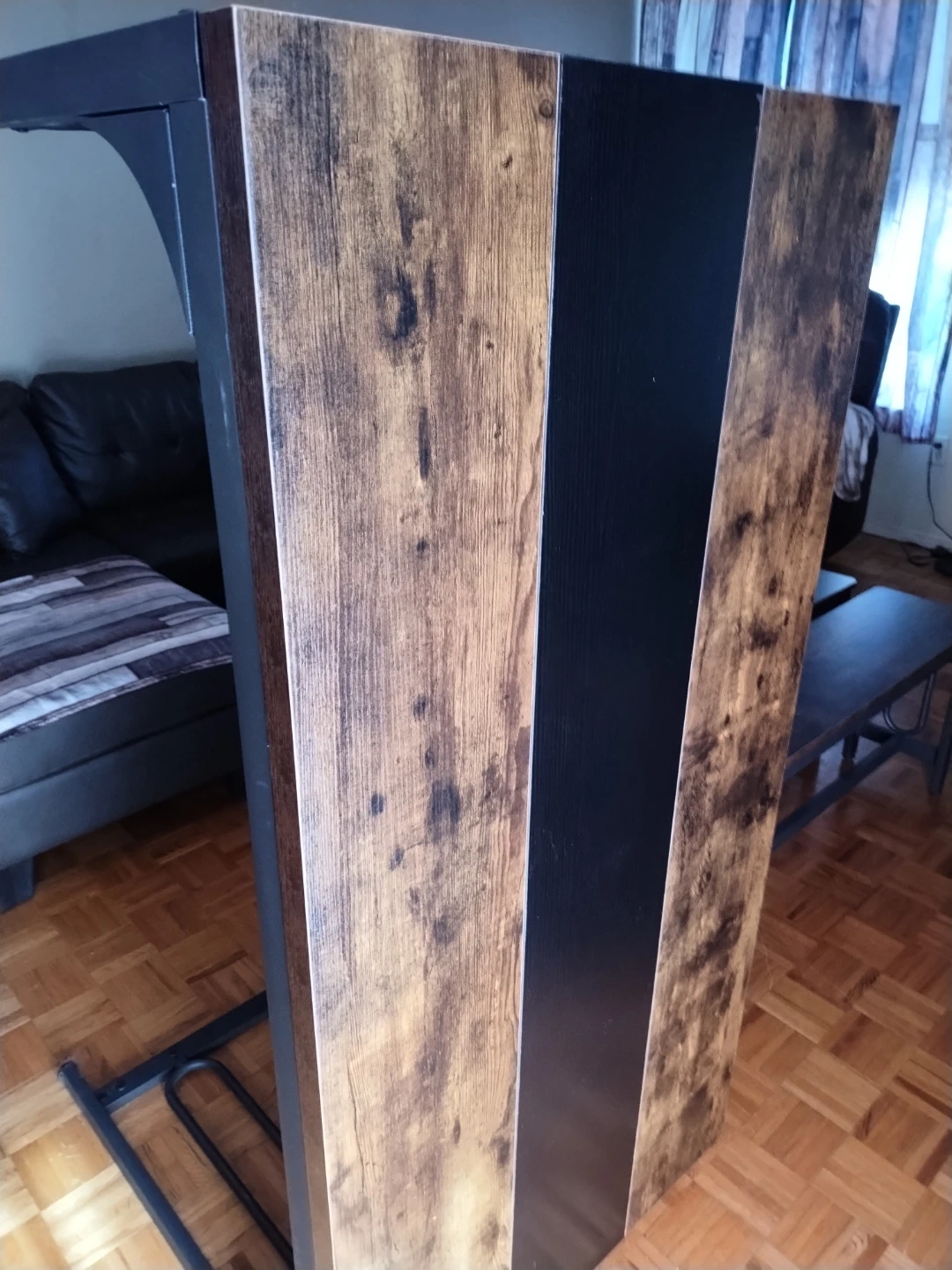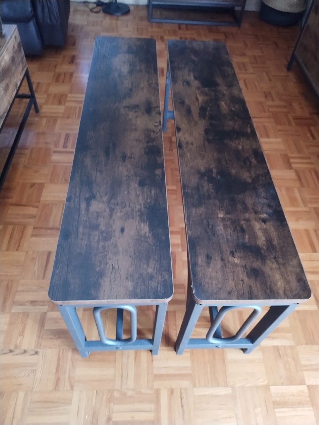 This dining set includes a table and two benches. It's made with a rustic wood finish and black metal frames. The benches tuck neatly under the table when not in use.