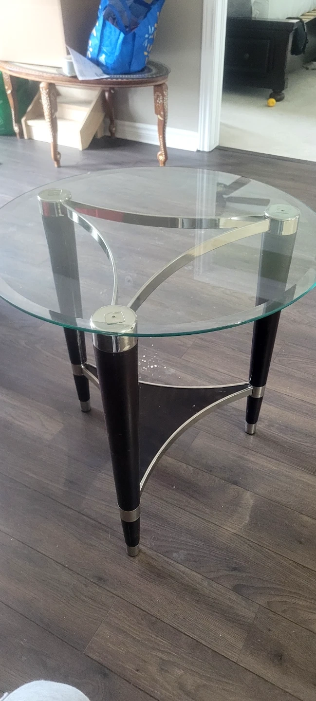 This oval coffee table features a clear glass top with a dark wood and chrome base. It's a stylish piece for your living room! The legs are made of dark wood with chrome accents.