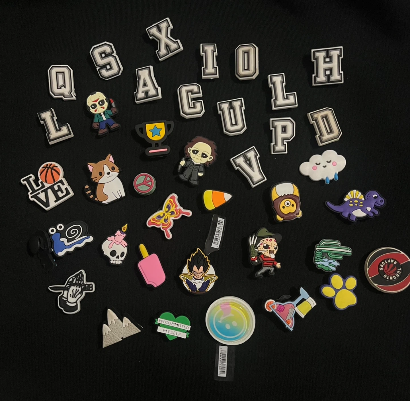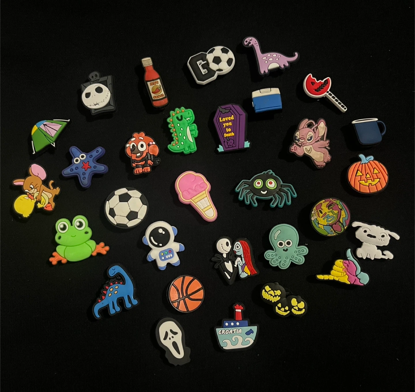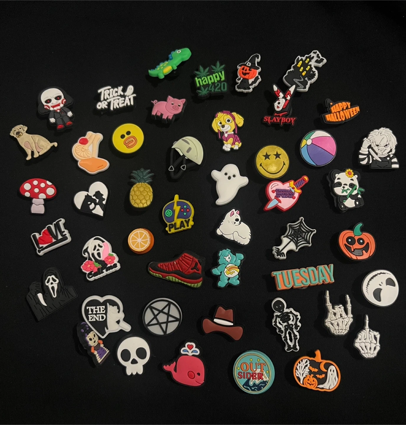 A large collection of assorted Jibbitz charms for Crocs shoes. These charms include a variety of themes like Halloween, pop culture characters, animals, food, letters, sports, and more. Mixed with real croc brand jibbits!