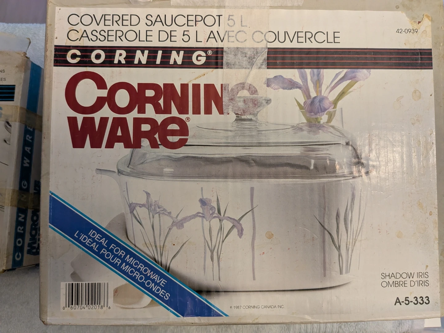 This is a Corning Ware 5L sauce pot with a clear glass lid with an iris floral design on the exterior. It's microwave, conventional oven, and stovetop safe. This dish is perfect for serving your favourite meals straight from the oven to the table! New - just sat in our cupboards (along with two other listed Corning Ware!) over the years.