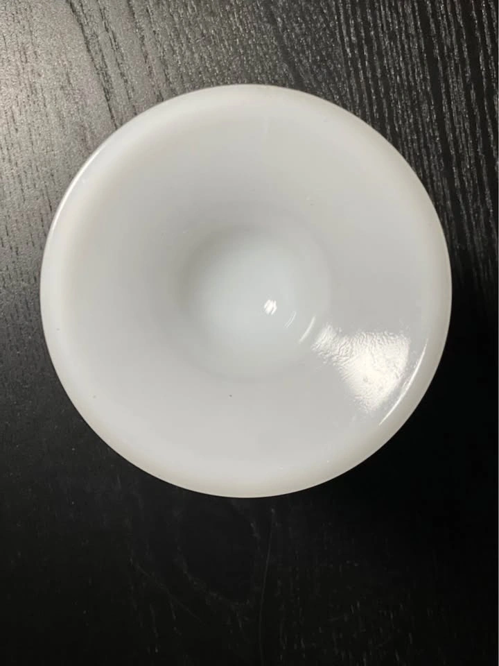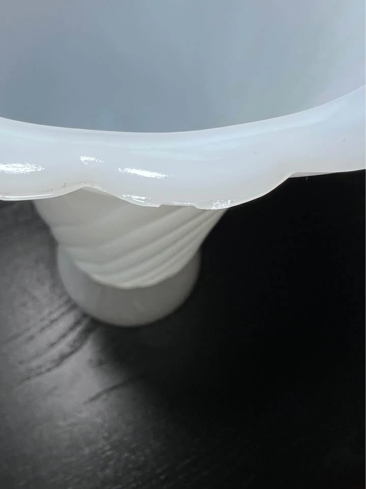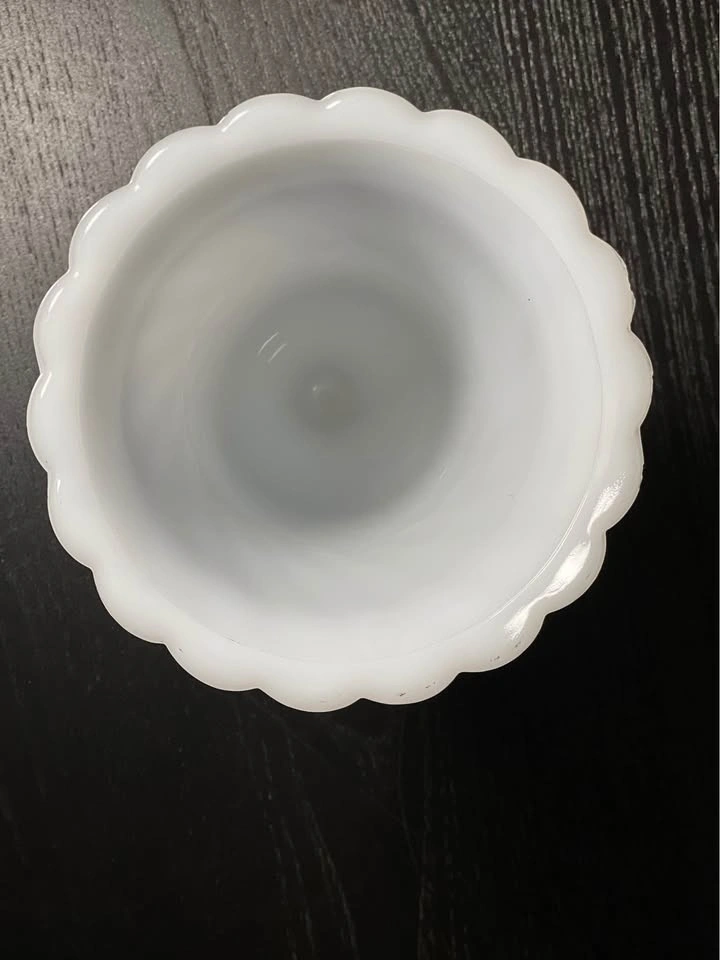 This is a vintage 9-inch milk glass pedestal vase with a distinctive swirl design and a scalloped rim. Made of opaque white milk glass, it features a swirl or ribbed pattern on the body and a flared or ruffled rim with a footed base. Similar vases were popular in the mid-20th century, particularly the 1960s. Pre-owned with small chips as shown in photos. Pickup is 58th and 7th Ave in midtown Manhattan.