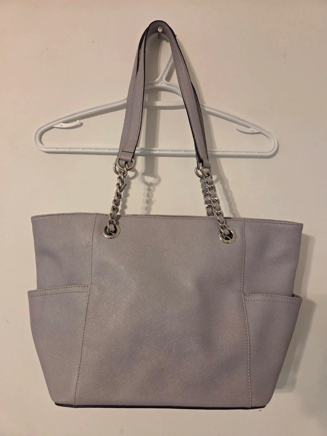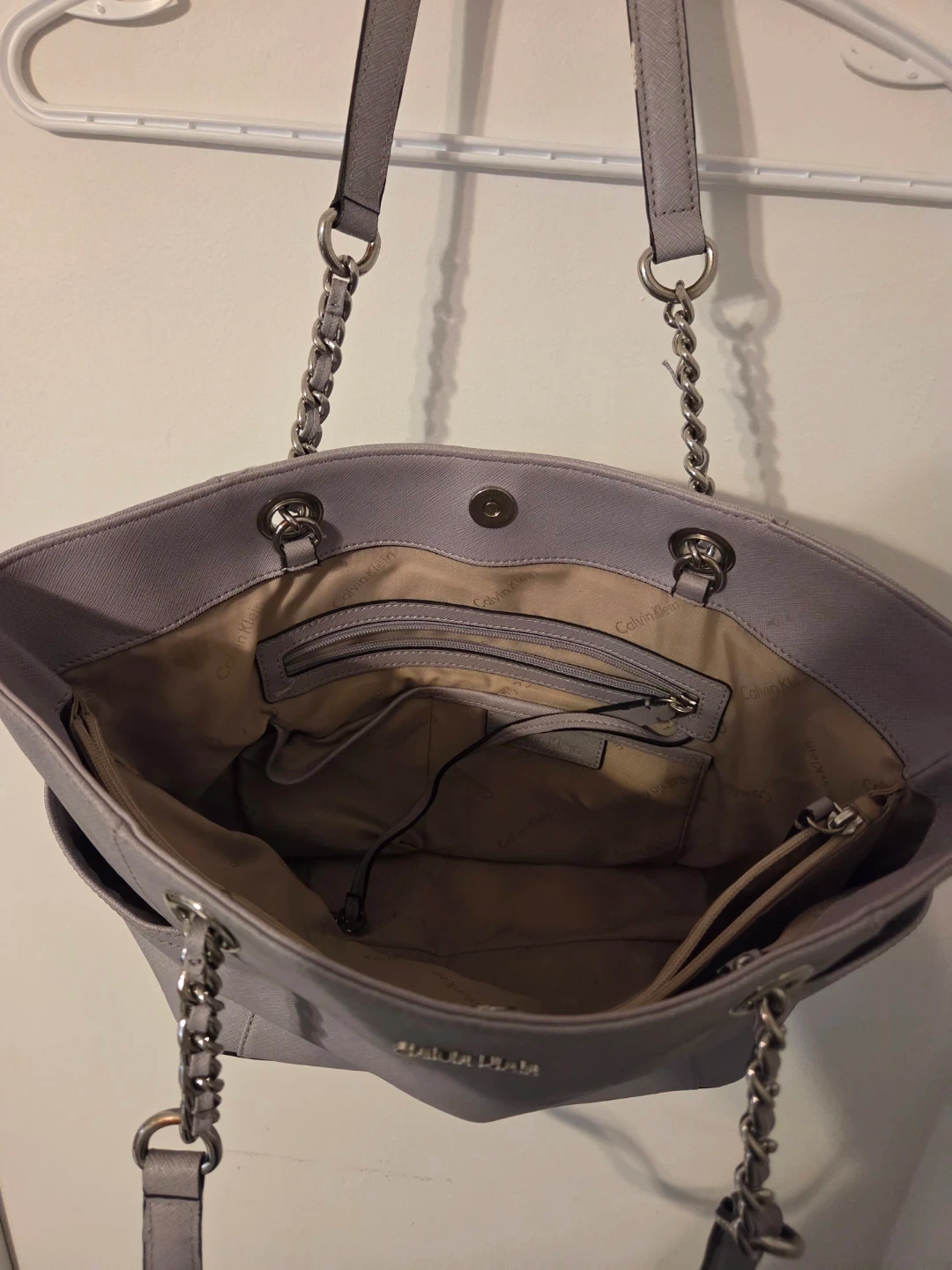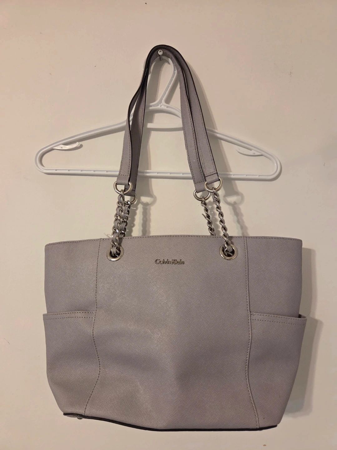 Calvin Klein tote bag in a light grey colour. It's made of durable Saffiano leather. Features chain link straps and exterior slip pockets. Interior includes a zippered compartment. $30