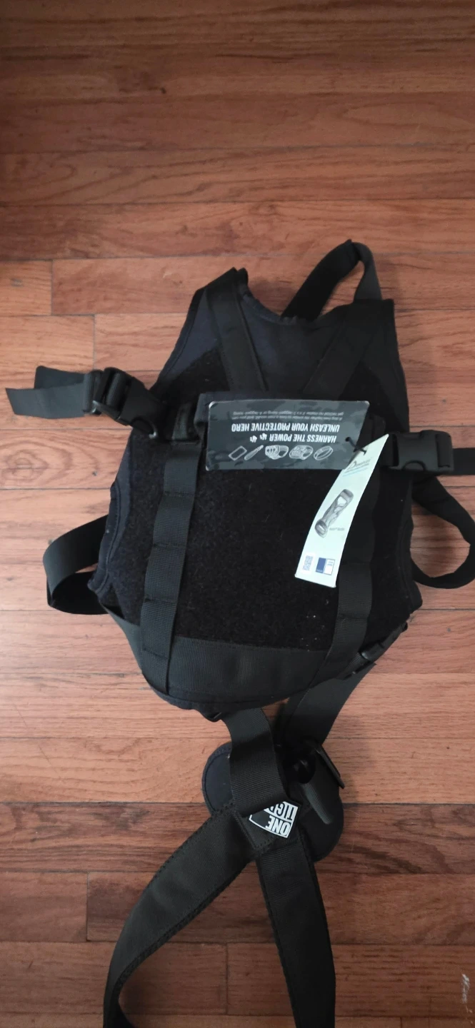 This is a black tactical dog vest harness from ONE TIGER. It's made with durable materials and features adjustable straps for a secure fit. The vest is designed for outdoor activities and training. It includes a handle for control and D-rings for leash attachment.