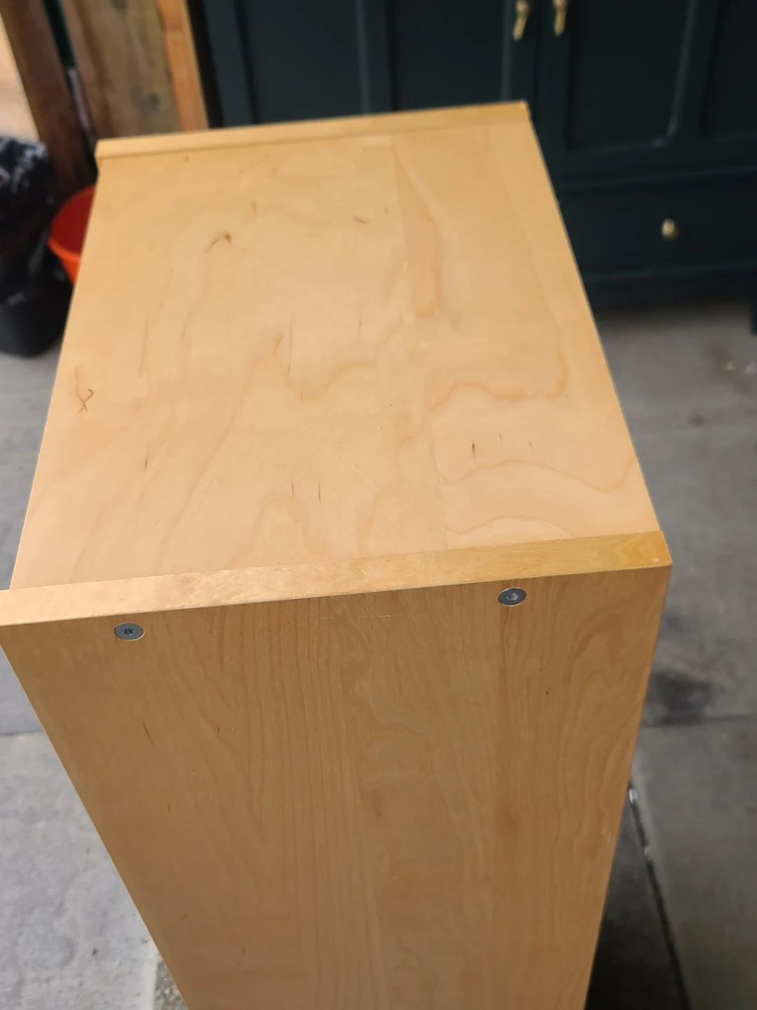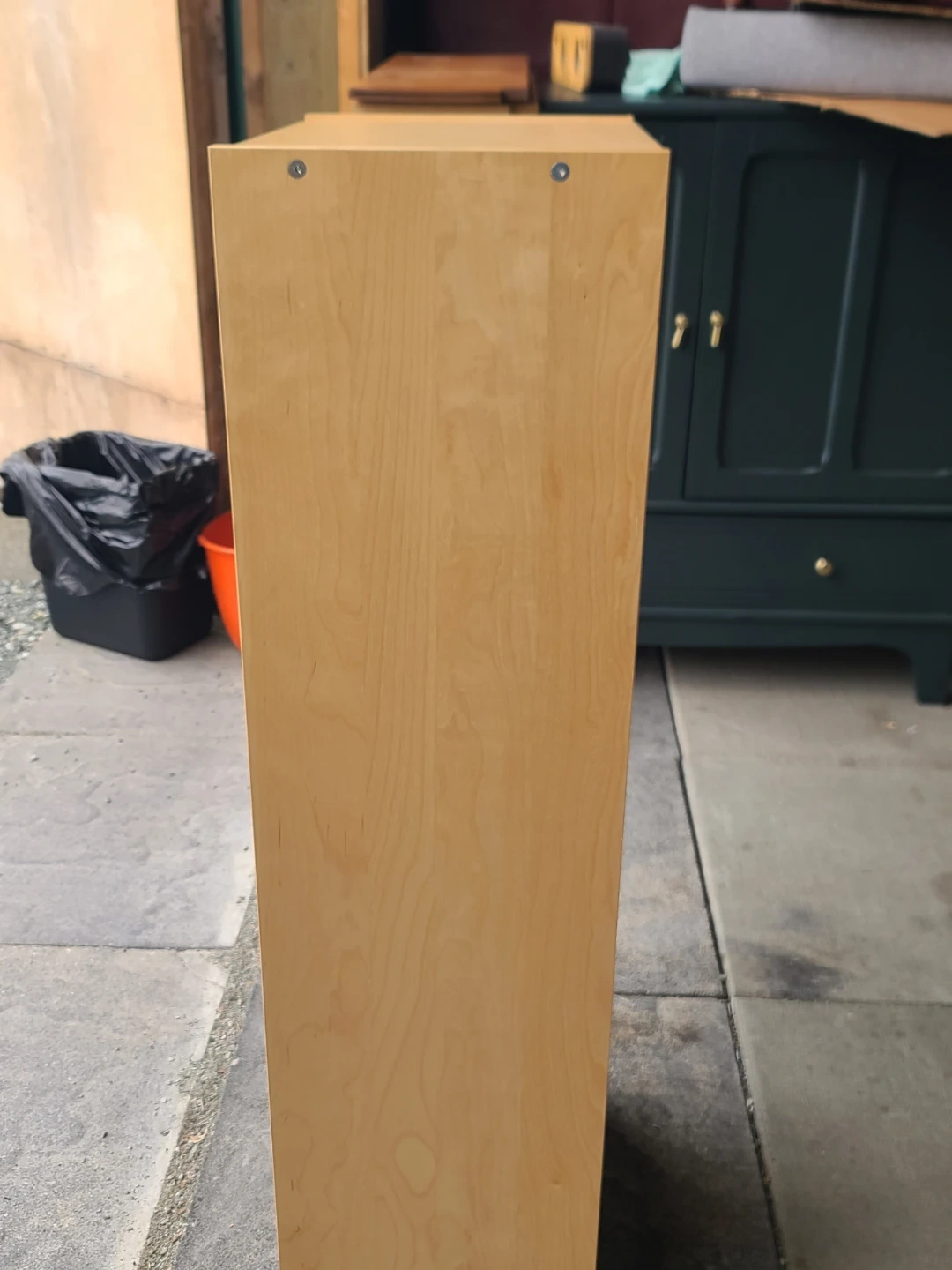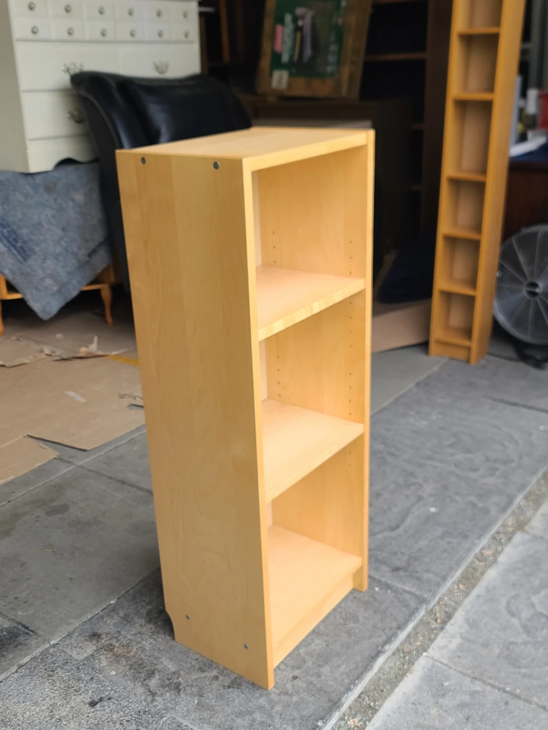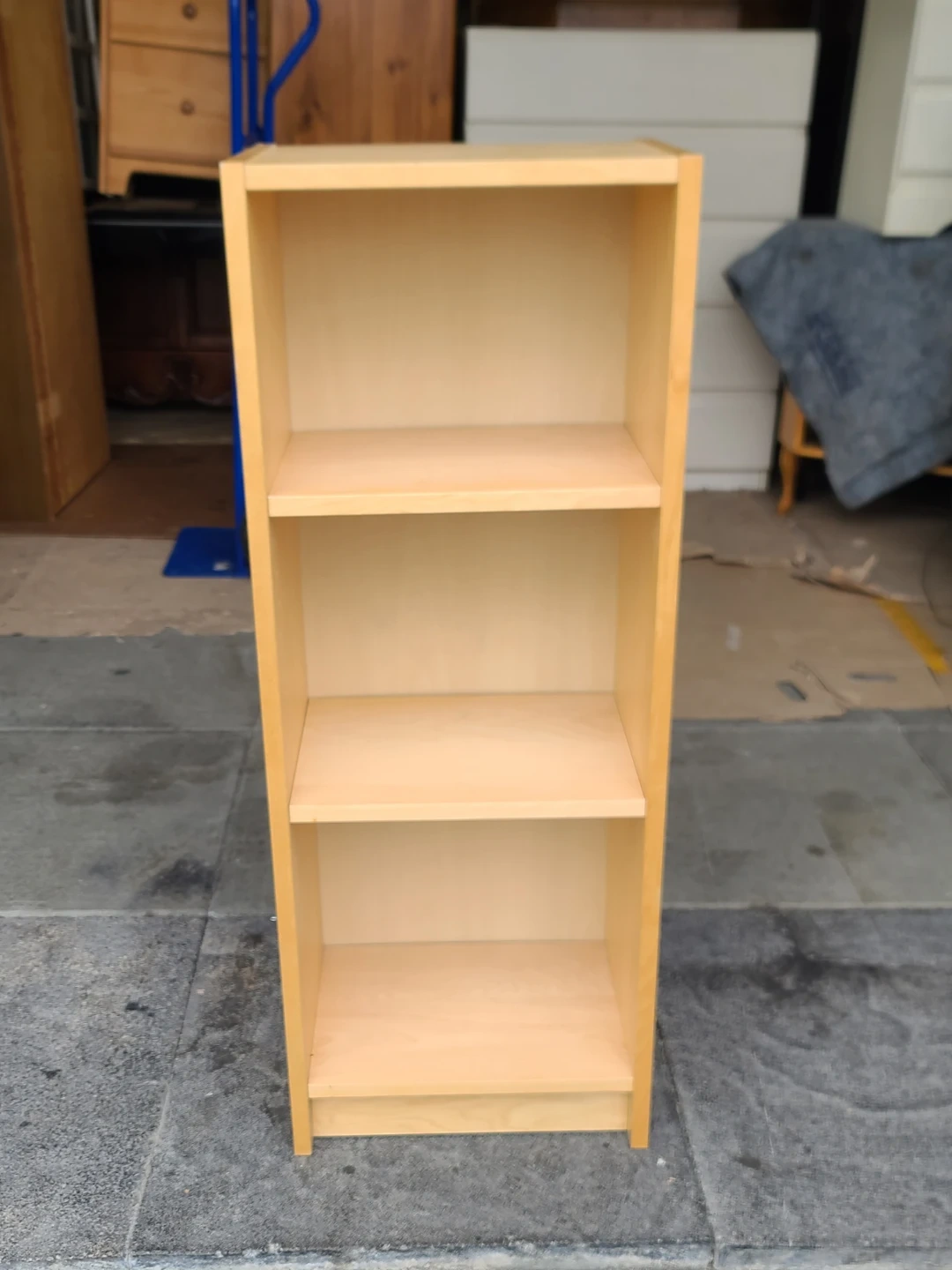 Simple bookshelf has 3 shelves. Light wood color. Shelves are adjustable. Good for books, decor, or storage. Measurements: W 16" X D 11" X 42". Delivery can be arranged. Viewing and pickup by appointment.