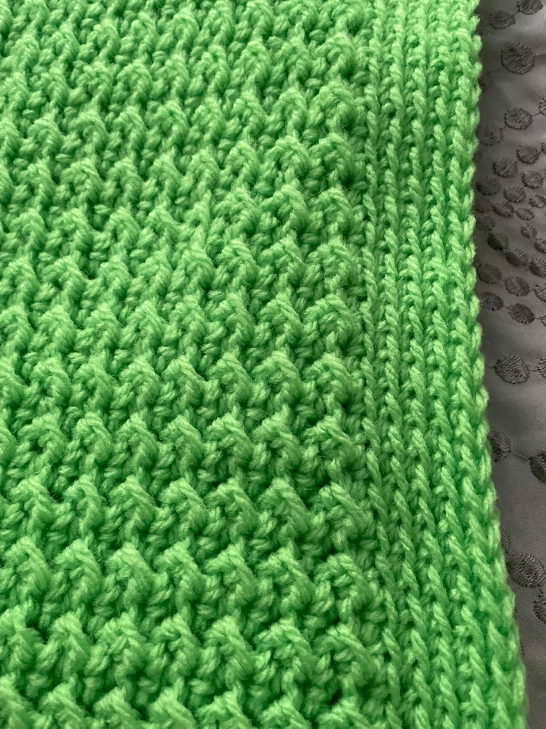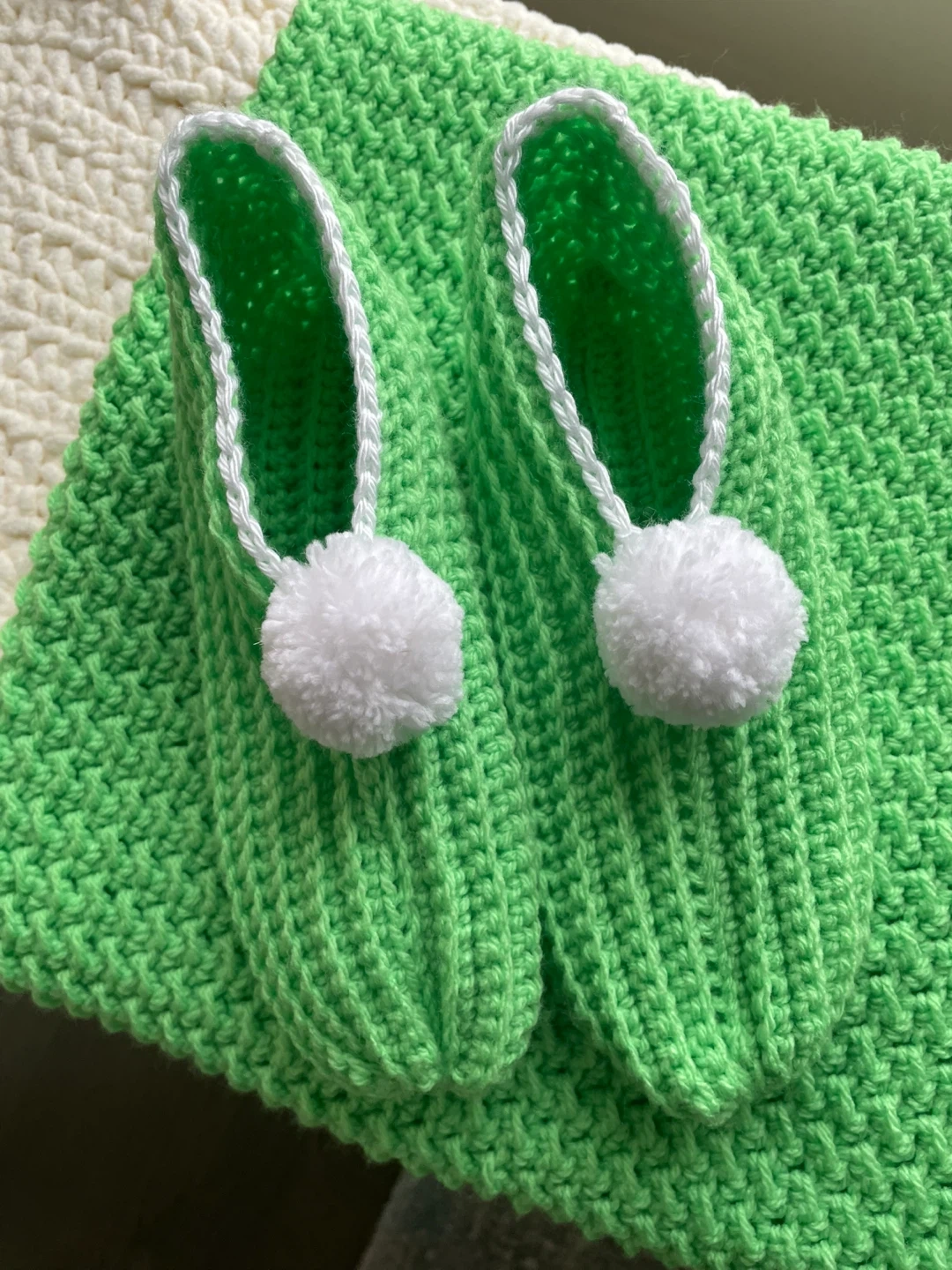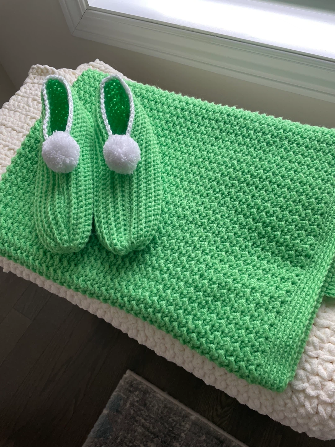 New handmade blanket and slippers, made in a SFPF home. Blanket measures 38 X 38” this blanket looks lovely on both sides with a nice border. The slippers are a size 7. The color is a bright green and the slippers are green with white trim. Pick up in Courtice.